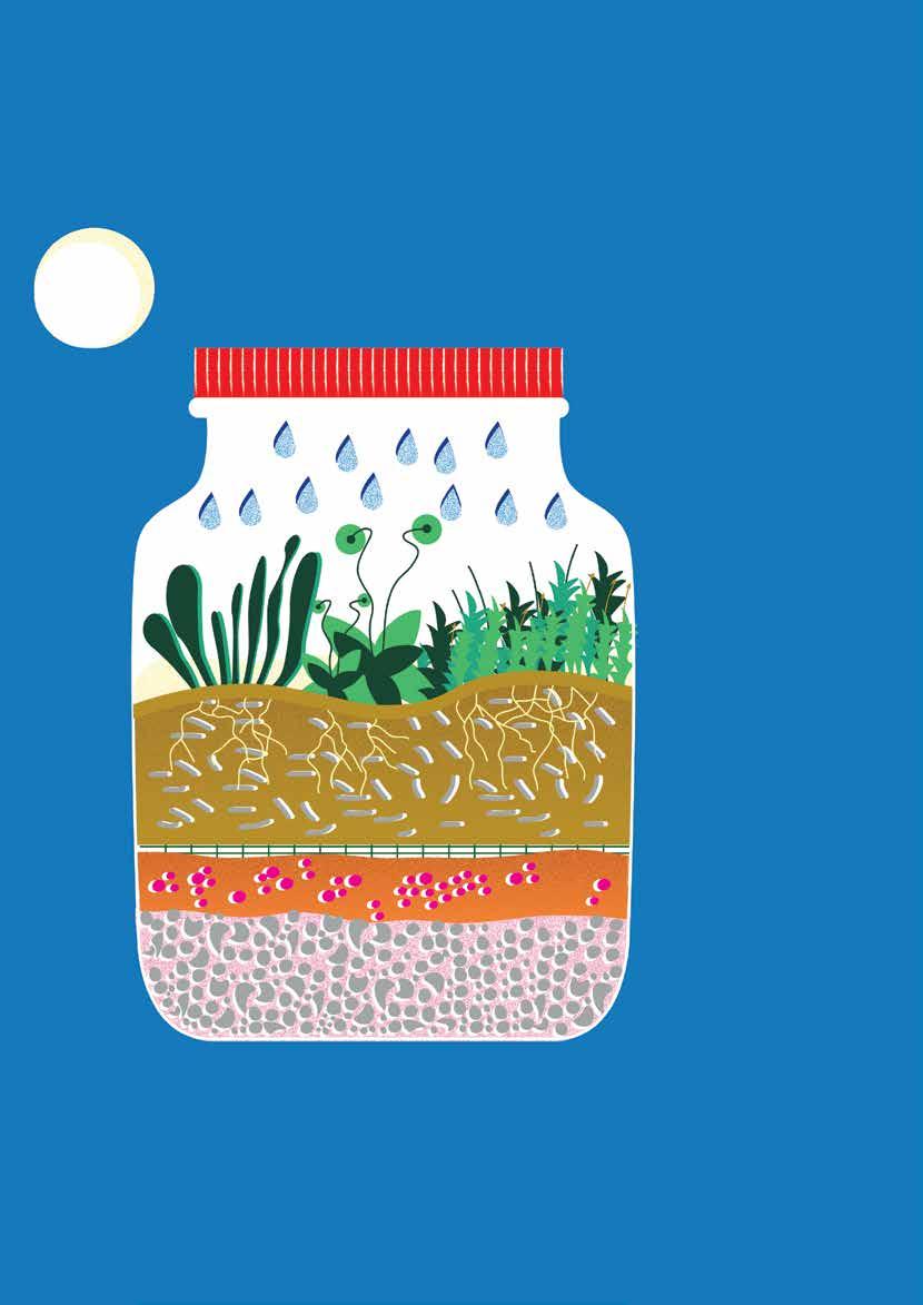 Un terrario è un ambiente chiuso di esseri viventi che può mostrarci come funziona un ecosistema. Crea il tuo ecosistema: chiuso il vaso, la pianta usa l'acqua, la luce del sole e le sostanze nutritive del terreno per sopravvivere. Quando la pianta perde alcune foglie, queste vengono distrutte dai batteri e diventano nutrienti nel terreno. Con il giusto equilibrio, l'ecosistema all'interno del terrario può sopravvivere per anni.