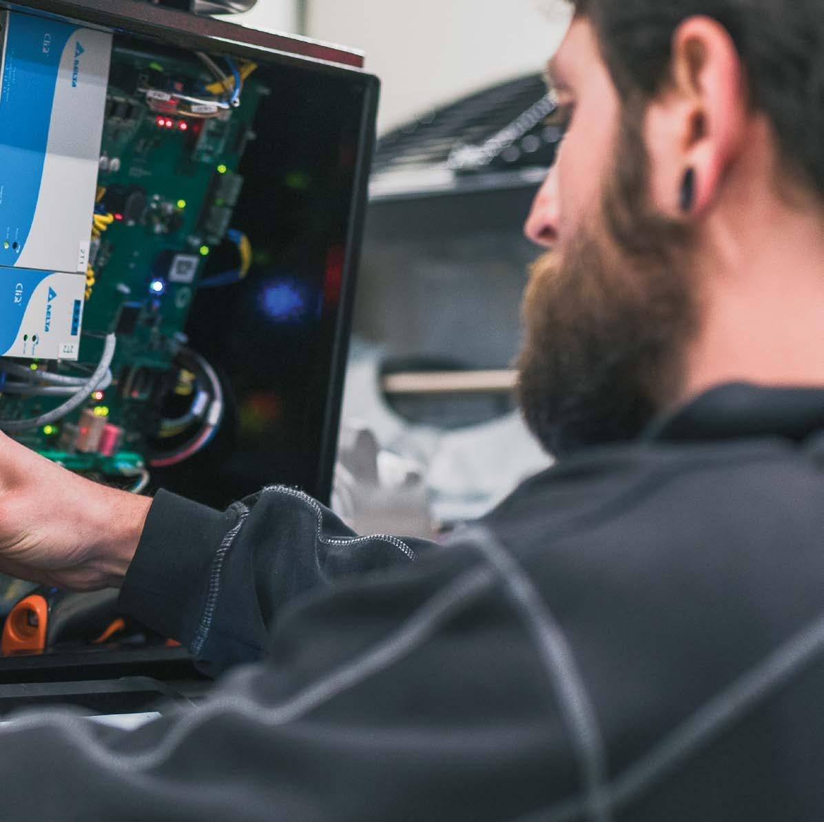 Un operaio al lavoro nella sede di Alpitronic, a Bolzano.