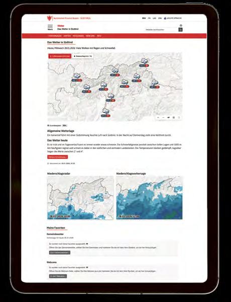 Interaktiv und dynamisch: So zeigt sich seit dem 21. Jänner das Wetterportal des Landes Südtirol. Die Südtiroler Informatik AG SIAG hat in Zusammenarbeit mit dem Landesamt für Meteorologie und Lawinenwarnung in der Agentur für Bevölkerungsschutz die Wetterseite grundlegend überarbeitet. Die Zahl der Zugriffe auf das Landeswebportal mit Wetter ist mit Abstand die höchste: Über 70 Millionen Mal wurde die Wetterseite im vergangenen Jahr aufgerufen, nahezu 30 Millionen Besuche wurden gezählt. Zur neuen Website gehören nun innovative Widgets, neue Analyse- und Progno -