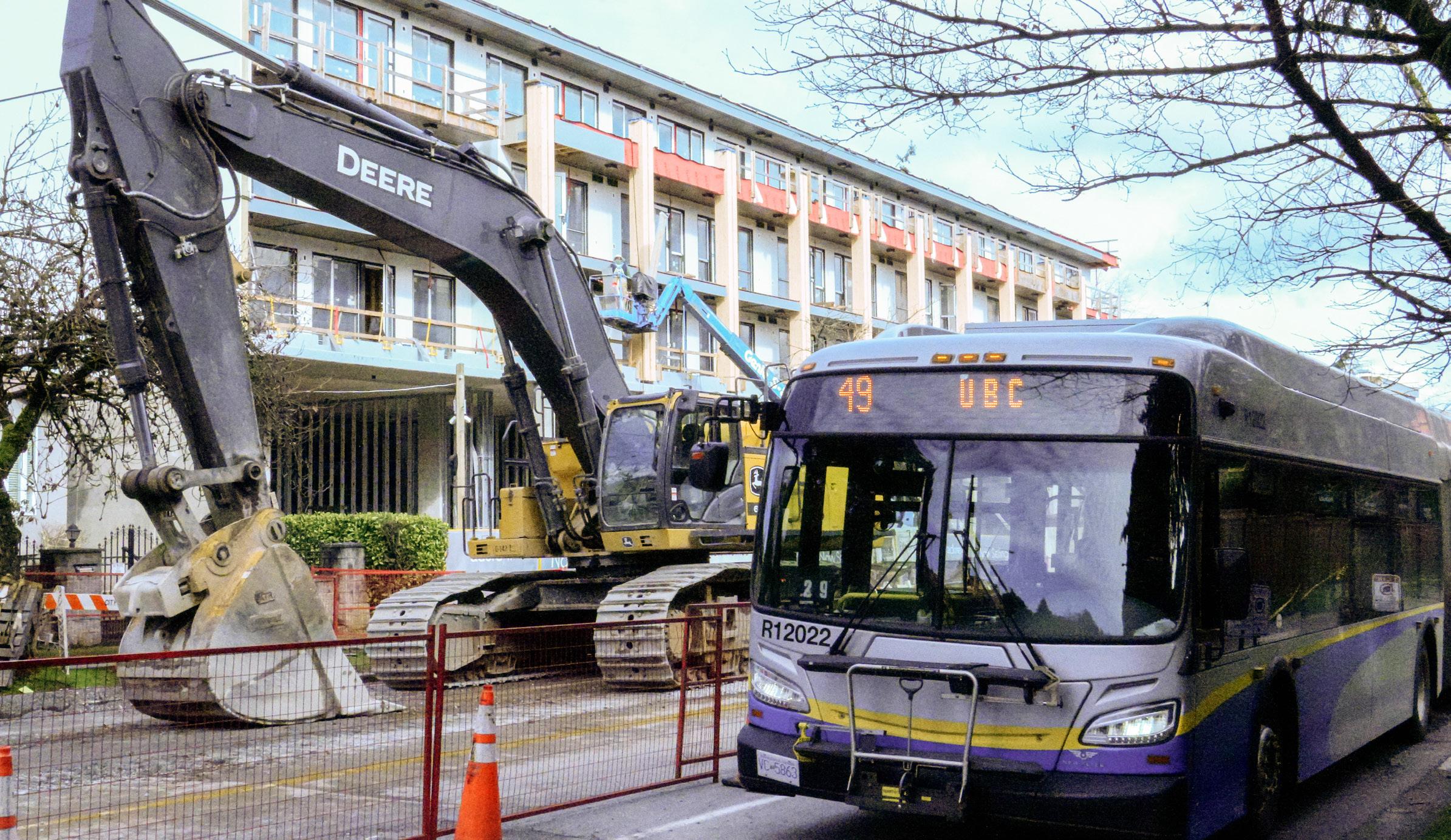 The 49 bus arriving along a new condo construction site near campus in Vancouver, B.C, on March 13, 2026. PHOTO BY EHXEA ANTOINE