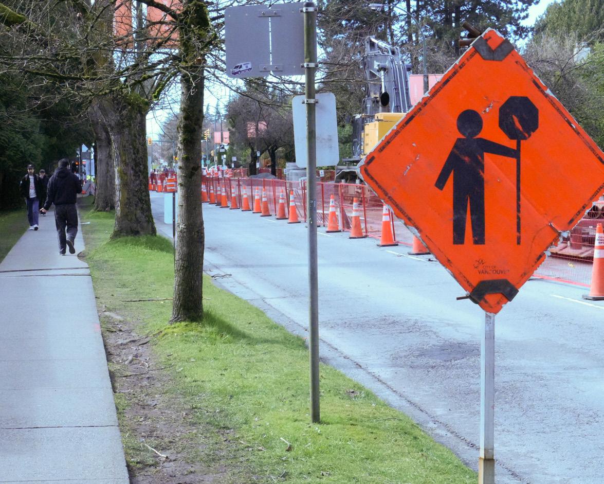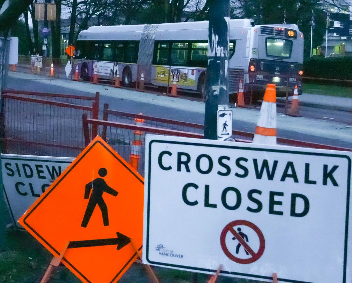 A sign saying “Crosswalk closed” along 49th Avenue across from bus stop near campus in Vancouver, B.C., on March 13, 2026. PHOTO BY EHXEA ANTOINE