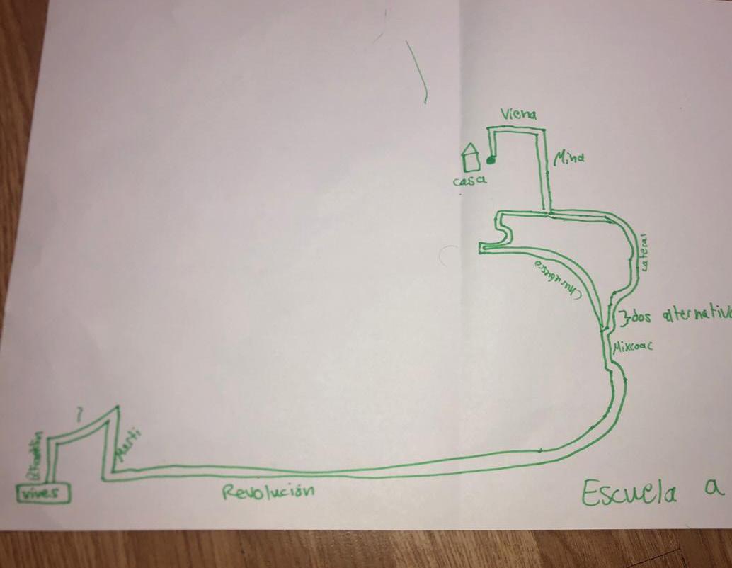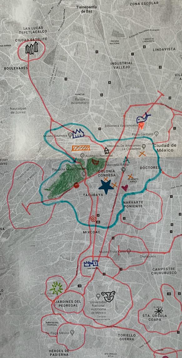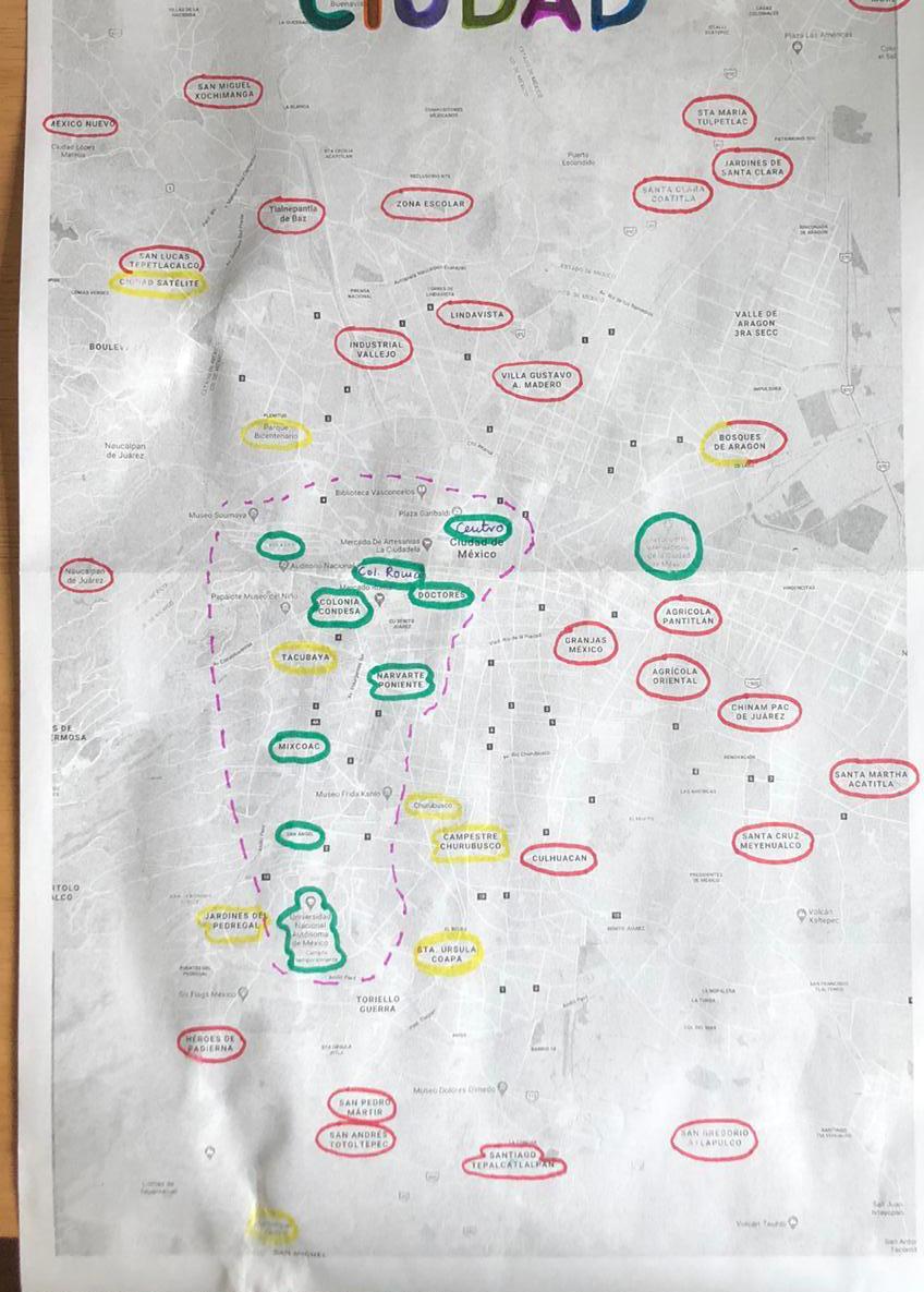 Nos apropiamos de los lugares en la medida que les otorgamos una carga emocional, otra simbólica. Entonces ya no son terrenos inhóspitos, pasan al lugar de lo conocido. El lugar antropológico de Marc Augé tal vez, puede ser incluso un centro comercial. Todos los jóvenes de la zona reconocen Plaza Delta, Plaza Patriotismo, o Reforma 222, sin embargo, por alguna razón, se refieren más a los parques, a la heladería, al café de la vuelta de la escuela, como sus lugares favoritos cerca del barrio. Sobre enfrentarse al mapa de papel, Mateo dijo: “Me tardé en encontrar todo porque quería encontrar muchas cosas. Logré encontrar casas de amigos, lugares que frecuento, o casas de mis familiares. Me divertí mucho y el hecho de que me divirtiera me hacía quedarme más tiempo encontrado cosas. Por ejemplo, veía una zona y lo relacionaba con todo lo que está cerca, veía la heladería Roxy y entonces encontraba