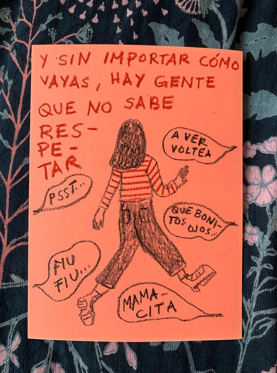 Valentina. Después pide: “Para toda la gente que chifla a las chicas en la calle: Por favor dejaran de hacerlo ¡No nos gusta! y solo nos asustan, si quieren hacer algo y ayudarnos dejen de chiflarnos, dejen de decirnos piropos, dejen de mirarnos así. Muchas somos simples niñas. Dejen de sexualizarnos”. Además de los grupos feministas y las acciones espontáneas de autocuidado, caminar en grupo resulta reconfortante y seguro: “Me gusta caminar en bola porque mis amigos no dejan que me pase nada, me siento más segura con ellos. Incluso responden a los que nos acosan. A veces dicen: ‘Hey, no te le quedes mirando’, ‘oye, las miradas para otro lado’, y así, entonces me siento mucho más segura con ellos”, cuenta Greta de catorce años.