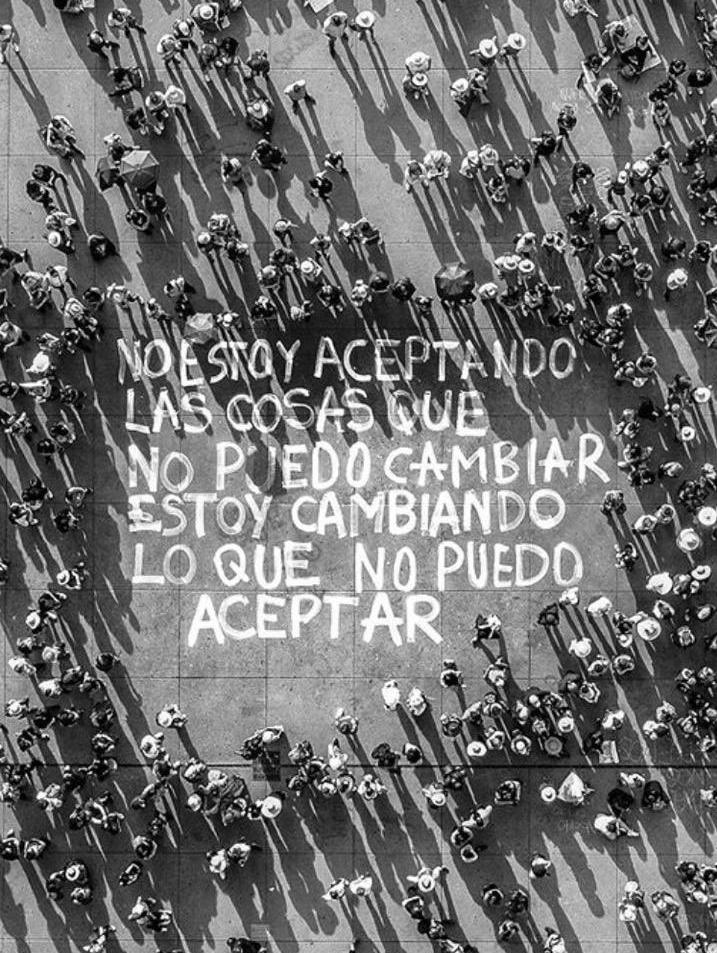 información y energía, y que se comunica sin necesidad de charla contrafáctica. Una cyborg a la manera de Donna Haraway que a través de la vibración de una consigna conmociona al entorno y resquiebra estructuras. “No estoy aceptando las cosas que no puedo cambiar, estoy cambiando lo que no puedo aceptar”, se leyó desde las alturas en el Zócalo de la Ciudad de México el 8 de marzo.