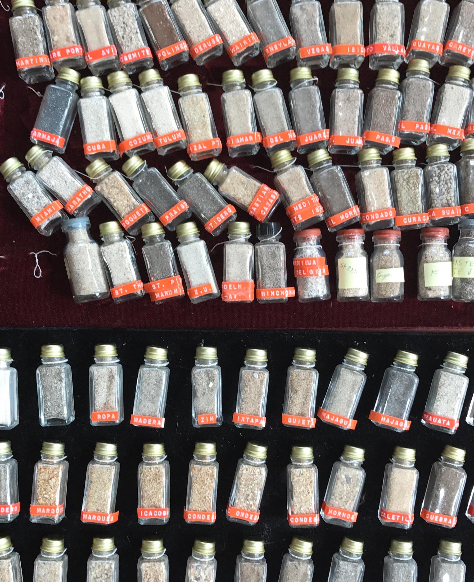 • Una tabla con frascos de arena de diferentes playas del mundo.