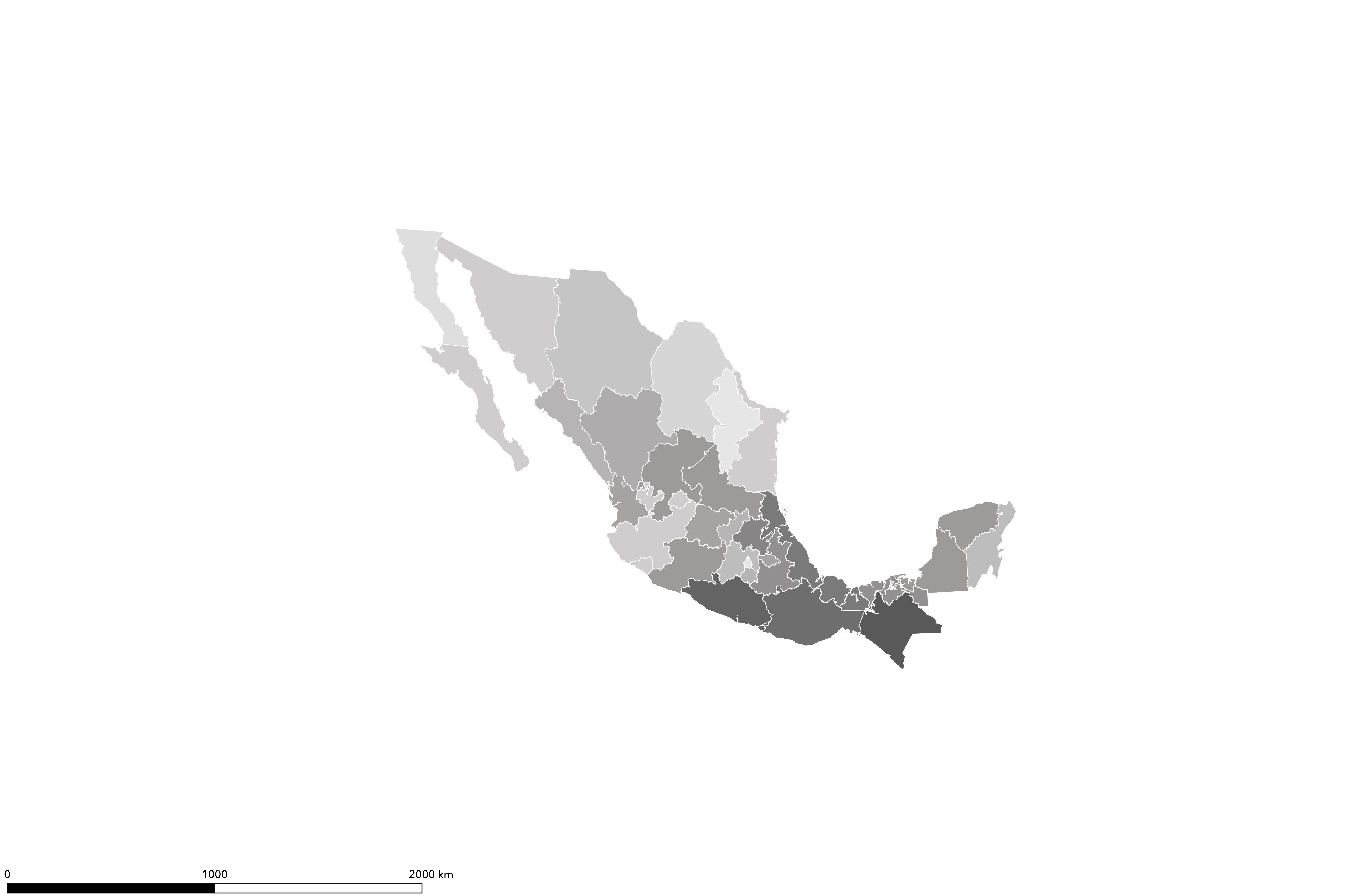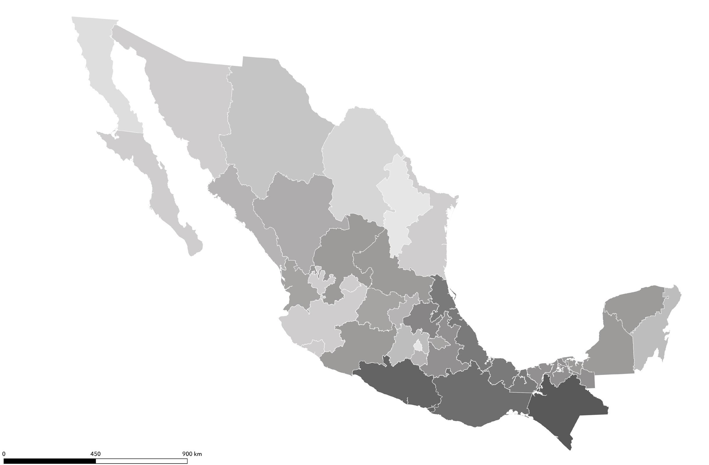 Según el registro del SIC (2021), las entidades con mayor concentración de librerías son: Ciudad de México, 493; el Estado de México, 119; Jalisco, 104; Guanajuato, 90; Nuevo León, 69; Puebla, 68; Chihuahua, 64; y Veracruz, 63. Este indicador no corresponde (STATISTA, 2021), sin embargo, con su densidad poblacional, grado de alfabetización o marginación (Mapa 1),