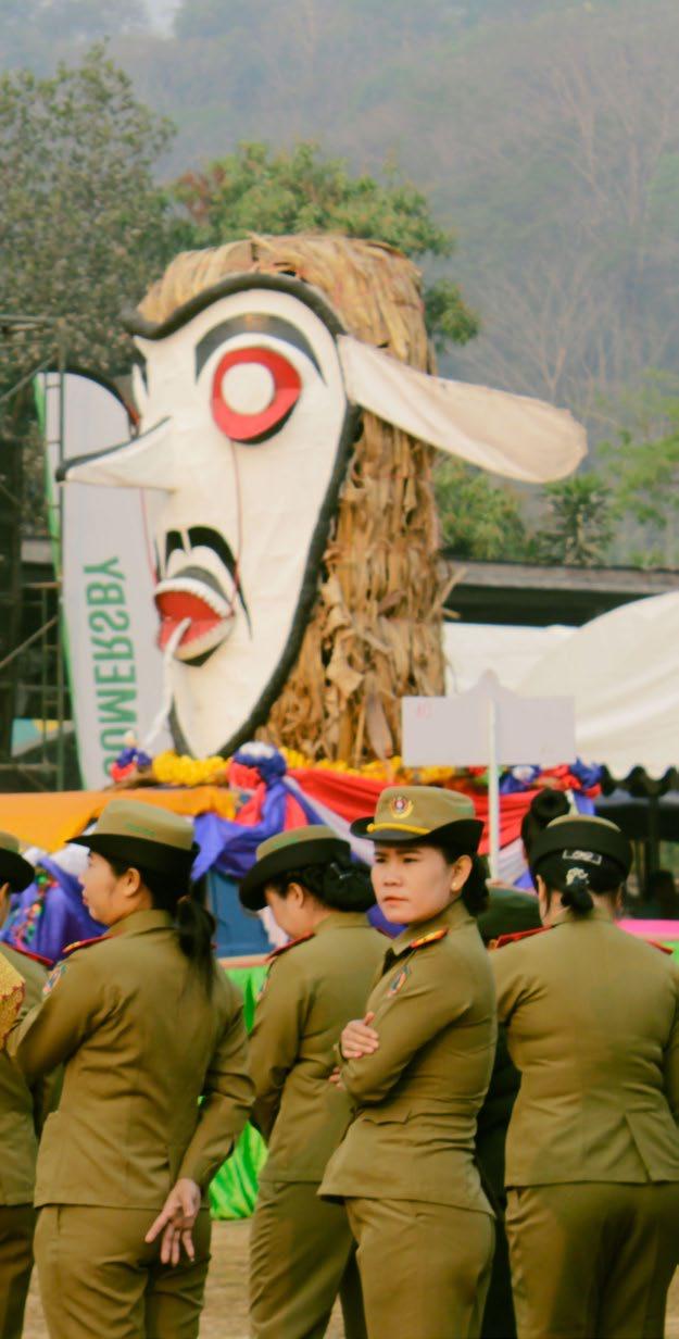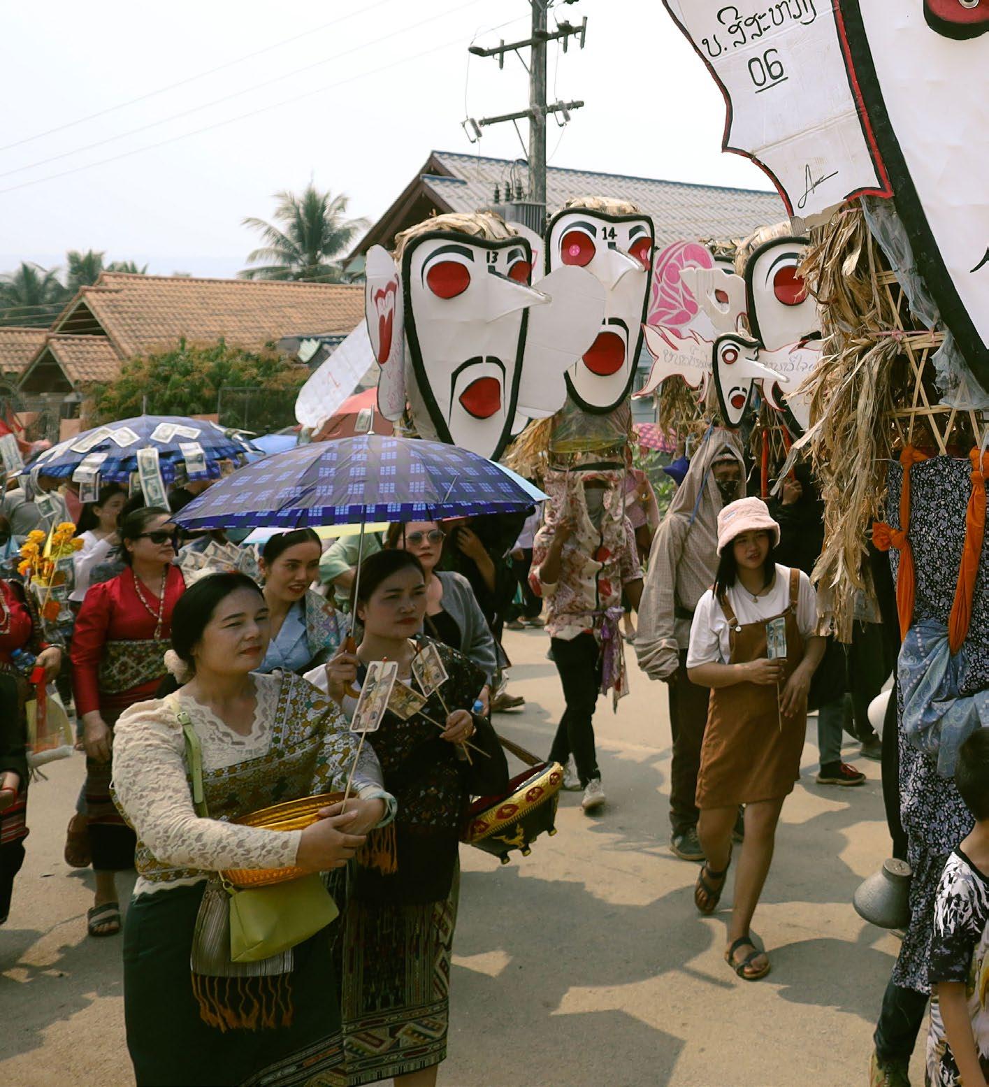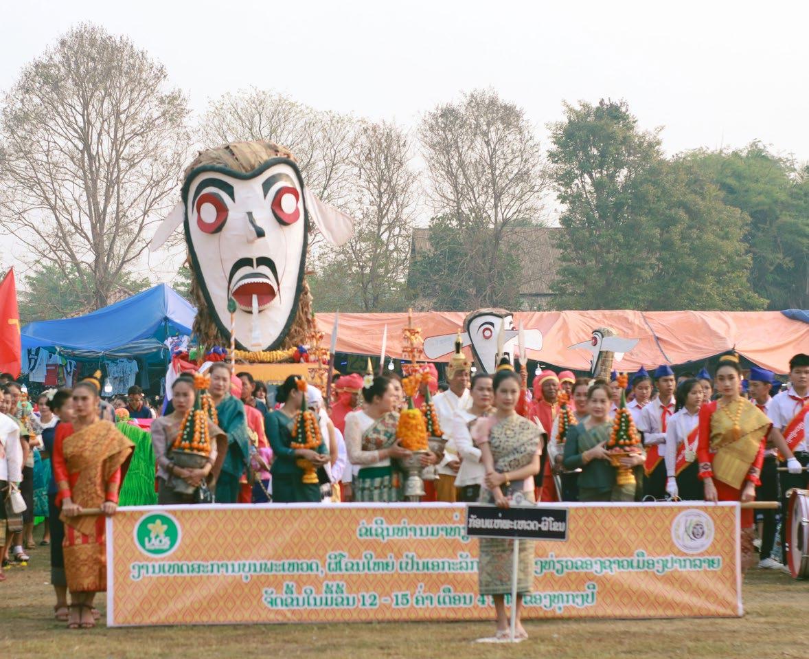 At 8 AM, people from numerous villages gather to commence the Paklay Ghost Festival. The crowd includes students, representatives from the Lao People’s Revolutionary Youth Union, civil servants, soldiers, police, various ethnic groups, and festival organizers. The parade’s main attractions are the huge ghost faces - between ten and thirty appear each year. After the initial ceremonies, people rush to