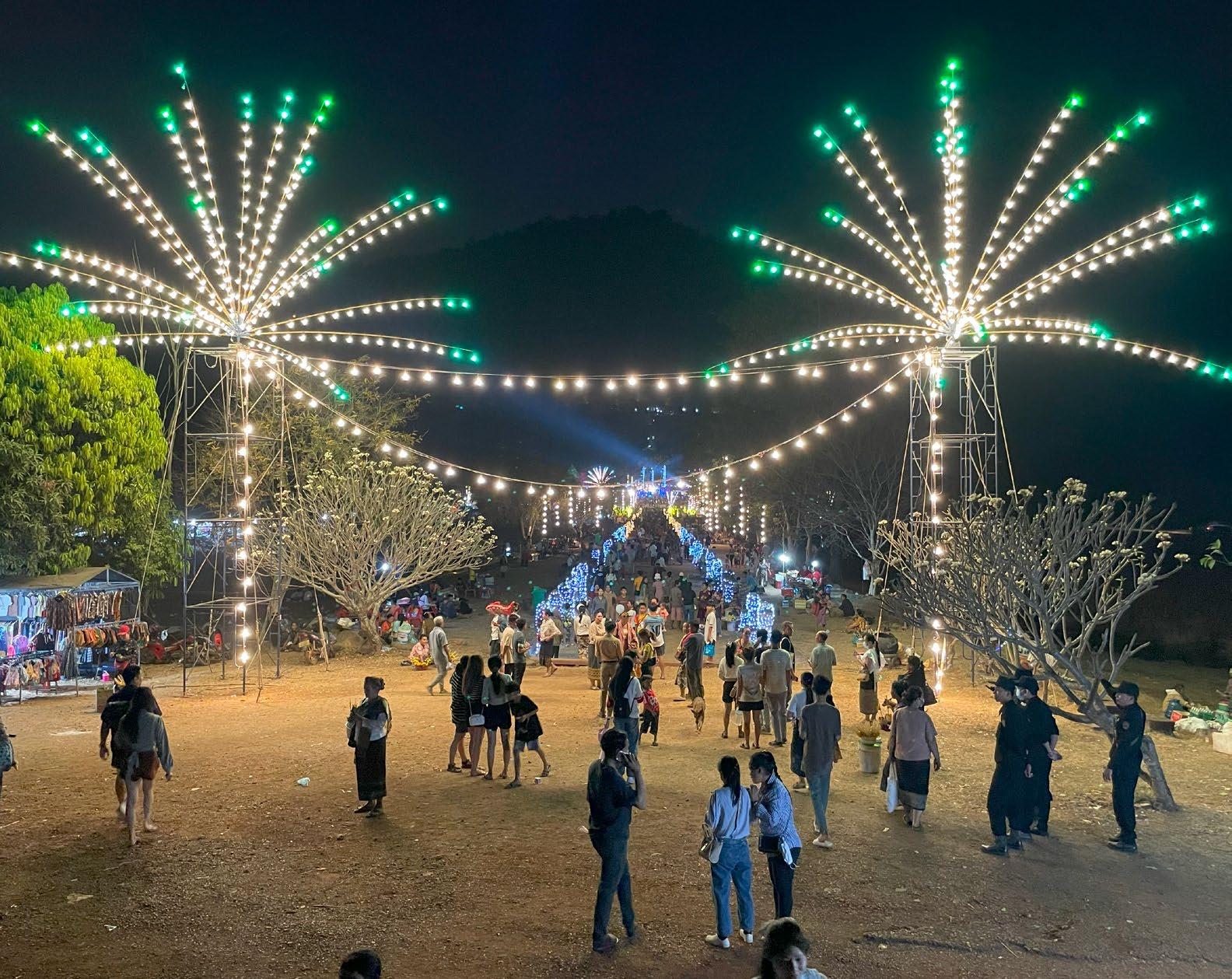 1: The grounds of Wat Phou are decorated with lights during the festival CAPTIONS