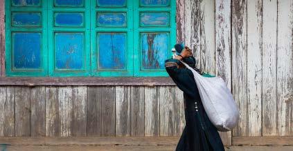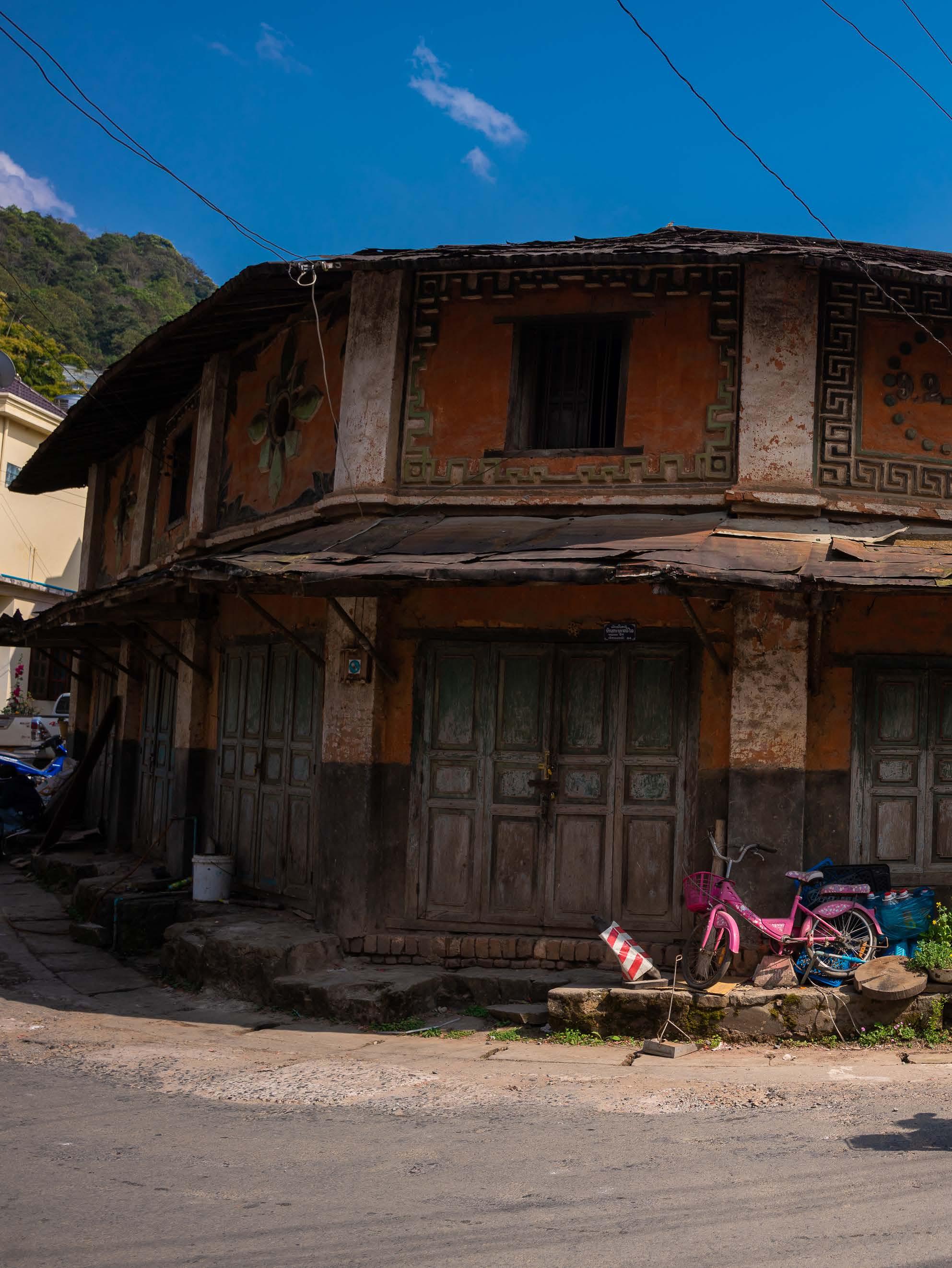 1: An Akha woman walks past a faded facade