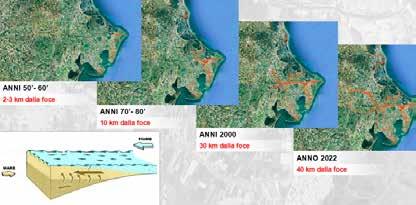 Il cuneo salino si forma alla foce dei fiumi, quando l’acqua di mare risale il fiume e occupa il fondo. Questo succede soprattutto quando c’è poca acqua dolce che scende da monte e il livello del mare è alto. Il fenomeno ha assunto negli ultimi decenni proporzioni sempre più preoccupanti con una progressiva intrusione salina lungo i corsi d’acqua. Da oltre un secolo, la bonifica combatte l’avanzata del sale, ma ora il pericolo è più grave che mai. Il cambiamento climatico, con siccità sempre più lunghe e fiumi in secca, ha aggravato un fenomeno già critico: l’intrusione del cuneo salino. Nel 2022 si sono toccati livelli mai visti, con conseguenze devastanti per l’irrigazione agricola e la disponibilità di acqua potabile, specialmente lungo la costa turistica. Il sale non risale più solo i fiumi principali, ma pene-