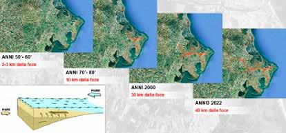 tra anche nelle falde sotterranee, mettendo a rischio l’intero sistema idrico del comprensorio. Nei periodi peggiori, il cuneo salino arriva fino a 30 chilometri dalla costa, avvelenando terra e acqua. È un’emergenza silenziosa, ma concreta. La particolare conformazione geografica e idraulica della foce del Po impone sfide complesse e senza precedenti. Di fronte a un territorio fragile e sempre più esposto ai cambiamenti climatici, il Consorzio di Bonifica Delta del Po è cerca soluzioni innovative, spesso sperimentali, che vanno ben oltre l’interesse locale. Qui si studiano e si applicano strategie che potrebbero fare scuola in tutto il Paese, perché il problema non è più solo del Delta, ma di un intero sistema a rischio. Le misure adottate per fronteggiare i cambiamenti climatici sono diverse come le barriere