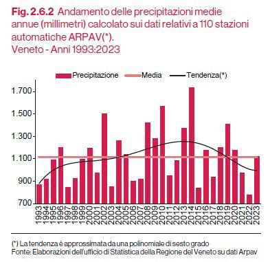 La pianura veneta sta cambiando rapidamente, surriscaldandosi e diventando teatro di eventi meteo estremi. Le estati si fanno più aride, le piogge intense e violente. Secondo gli esperti di Ca’ Foscari, le temperature medie sono cresciute di 0,6°C a decennio dal ‘93 al 2022, superando la media globale. Ondate di calore prolungate (>30°C) colpiscono soprattutto il sud-ovest. Le precipitazioni sono sempre più variabili: estati secche, inverni leggermente più piovosi. Le piogge estive, brevi ma intense, a volte con grandine. In montagna piove di più in autunno, in pianura meno frequentemente ma più intensamen-