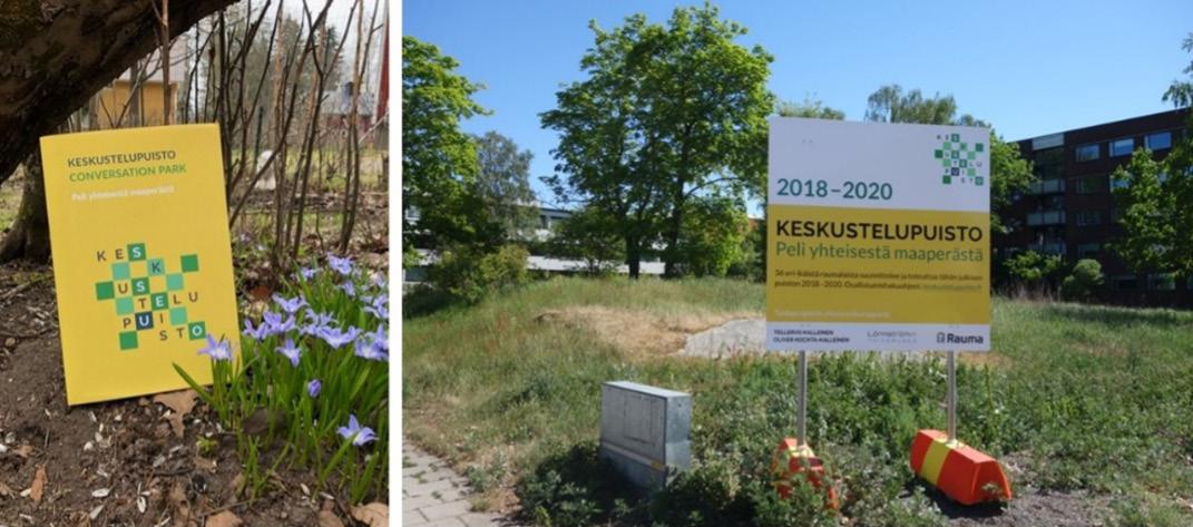 Hanke kutsui Tellervo Kalleisen pitämään al kuluennon yhteisötaiteesta, teoksista ja tavasta toteuttaa niitä. Esimerkkien viitoittamana läh dettiin luomaan omaa yhteisötaideprojektia Katoava puisto. Inspiraationa ja teoreettisena viitekehyksenä toimi Tellervo ja Oliver KochtaKalleisen Lönnstömin taidemuseon yhteistyönä toteuttama yhteisötaideteos Keskustelupuisto sekä teoksesta koostettu kirja Keskustelupuisto - Peli yhteisestä maaperästä (kuva 2). Keskuste lupuistossa kaupunkilaiset muuttivat Raumalla sijaitsevan joutomaan julkiseksi puistoksi. Kes kustelupuiston tavoitteeksi oli asetettu luoda yhteinen urbaani puisto osallistujien yksilöllis ten visioiden pohjalta käyttäen pelillistämistä, siirtoja ja keskusteluja.