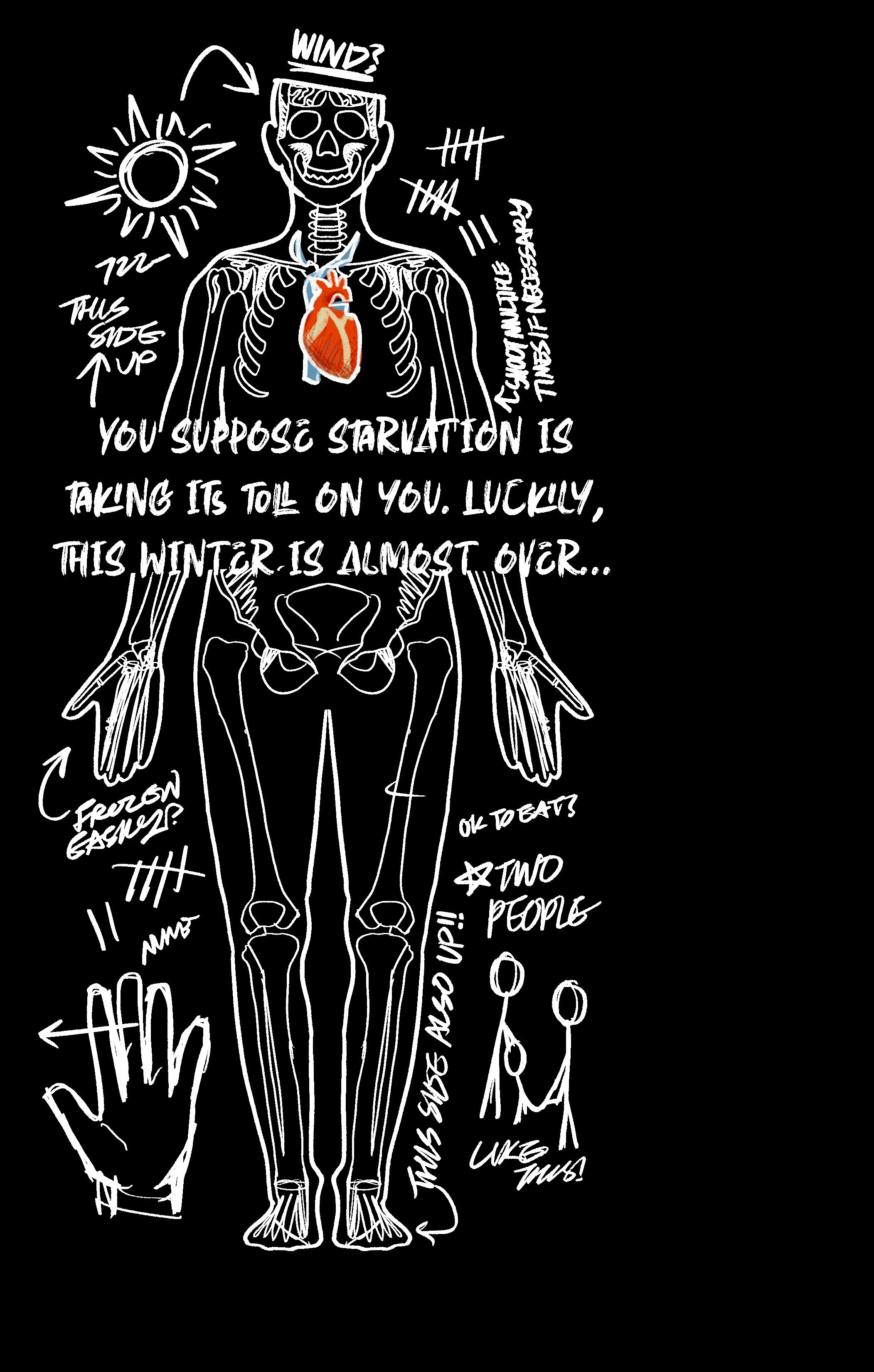 You all eat in the darkness. All three of you are ravenous. You’re almost surprised at how hungry you are. You suppose starvation is taking its toll on you; luckily, this winter is almost over...