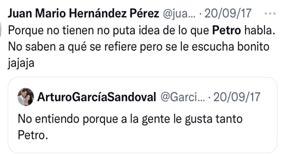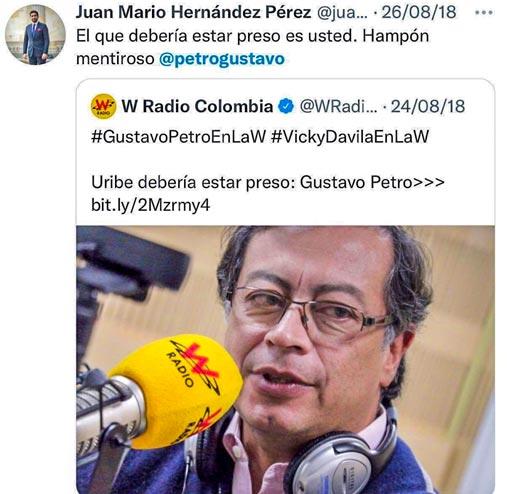 que insultaba al presidente Gustavo Petro. Los insultos criticaban al jefe de Estado, se publicaron durante la campaña presidencial de 2018, en los que Gustavo Petro lideraba las encuestas para llegar a la Presidencia. Mensajes como “Juro por mi vida que si Piedad Córdoba o Gustavo Petro llegan a la presidencia, con dolor dejaré mi patria amada. (Guarden este tuit)” y “El debería estar preso es usted. Hampón mentiroso”, se publicaron desde la cuenta personal de Hernández en 2017 y 2018. Pese a eso, el hombre no vio problema con trabajar en el viceministerio de la Vivienda que, por su puesto, está bajo la dirección del presidente Petro. Fue por esas incoherencias que cientos de cibernautas de todas las corrientes políticas salieron a criticar el nombramiento e, incluso, a burlarse de la postura de Hernández.•