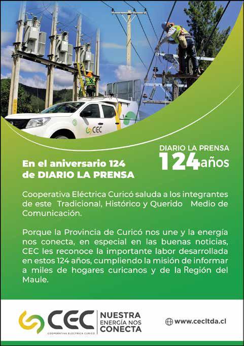 las familias, y en ello compartimos similitudes que nos hace estar en el seno de los curicanos”, acotó. A mbos profesionales, junto al directorio de CEC, encabezado por su presidente, Nelson Ramírez enviaron un saludo a los integrantes de La Prensa, en este aniversario 124: “La provincia de Curicó nos une, Nuestra energía nos Conecta con cientos de familias, por ello vaya el deseo que a los 124 años se sigan sumando años de presencia en la zona, con calidad y siempre como hasta hoy, conectados con sus lectores”, puntualizaron saludando al diario de los curicanos.