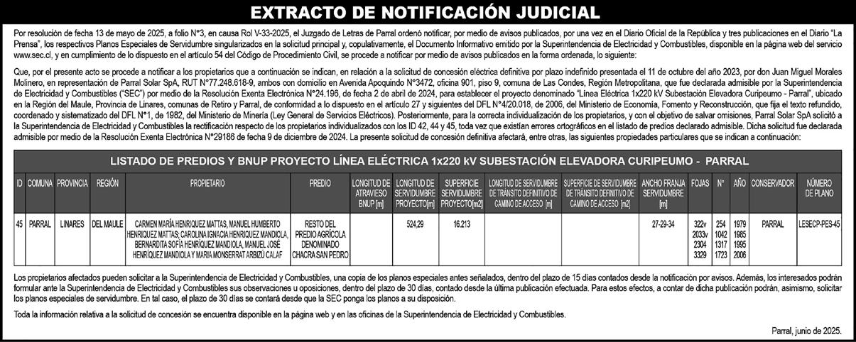 R E M A T E J U D I C I A L. Por resolución Primer Juzgado Letras Curicó, se ha ordenado subastar el 29 de julio de 2025, a las 12:00 horas, en forma remota, mediante la plataforma zoom, en forma conjunta y en un mismo acto: Uno) el Lote B, reserva, o resto de la Parcela Dieciocho del proyecto de Parcelación Porvenir, comuna Rio Claro, provincia de Talca, que deslinda: NORTE: con Lota A, separado por cerco; ORIENTE: con Lote A, parcela diecisiete y Sara Montecinos, separado por cerco; SUR: con camino público que va de Bellavista a Cumpeo, con Sara Montecinos, Carmen Montecinos y Roberto Montecinos, separado por cerco; y, PONIENTE: con camino de acceso de cuatro metros de ancho que le da salida a camino público y lo separa de Sergio Cáceres y lote Cinco de don Juan Mondaca, separado por cerco. Rol de Avalúo Nº 25-395 comuna Río Claro. Dos) Derechos de aprovechamiento de aguas que sirven para riego propiedad antes singularizado, consistentes en 1,66 l/seg., equivalentes a 0,14 acciones en la Comunidad de Aguas Canal Bellavista Porvenir. La propiedad figura inscrita a fojas 17.276 N° 5.524 Registro Propiedad Conservador Bienes Raíces Talca, año 2011 y los derechos de aprovechamiento de aguas a fojas 445 N° 378 Registro