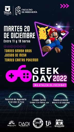 “Geek Day” en la Universidad de Talca. El martes 20 de diciembre, desde las 11:00 horas, en la Facultad de Ingeniería de la Universidad de Talca, sede Los Niches, en la comuna de Curicó, se llevará a cabo el evento “Geek Day Universidad de Talca”, Corresponde a una actividad que ha sido desarrollada junto a LvL Up Geek Store, tienda curicana dedicada al rubro de juegos de mesa, figuras coleccionables, juegos de cartas, juegos de consolas, entre otros elementos del mundo geek. El evento contará con stands de las carreras de la facultad, pymes de estudiantes, torneos de cartas Pokémon, torneo de Super Smash Bros, juegos de mesa (abiertos a todo público), juegos de consola PS4 y WII U (abiertos a todo público), juegos de miniaturas, entre otras actividades. Para quienes quieran asistir además se pondrán a disposición buses de acercamiento.