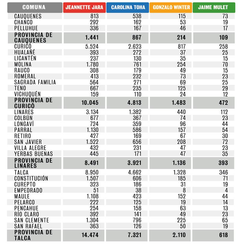 En las provincias, en Curicó Jara logró 10.045 votos; en Talca, 14.474 sufragios; en Linares, 8.491 y en Cauquenes obtuvo 1.441 votos (ver nota en página 3).