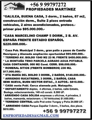 - TALCA: Departamento segundo piso, a pasos U. Talca, 2 dorm. c/ closet, 1 baño, cocina semi amoblada, 1 estacionamiento. 2.200 UF. “Solo reales interesados”.