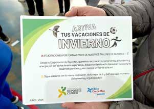 adaptado. Estas actividades no solo promovieron el movimiento y el trabajo en equipo, sino también un entorno seguro y estimulante, donde se fortalecieron vínculos sociales y se vivieron momentos memorables. La clausura incluyó una emotiva ceremonia de entrega de diplomas que reconoció la participación de cada niño y niña. Además, como premio especial, se regalaron entradas para asistir al “Circo Gigante de México”, espectáculo que actualmente visita Curicó, cerrando así una experiencia invernal inolvidable.