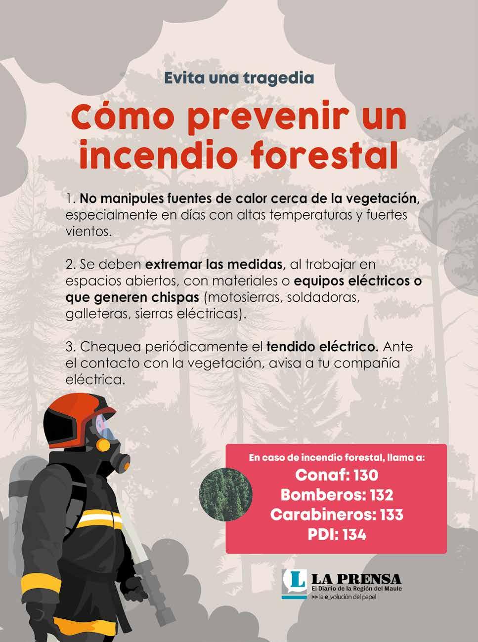 el Maule expresó que a través del Equipo Preferente de incendios Forestales “ya se han esclarecido algunos hechos, antecedentes que están siendo puestos a disposición del Ministerio Público, trabajando de forma directa con el fiscal con dedicación exclusiva”. Por último, el oficial superior hizo un llamado a la ciudadanía a denunciar cuando sean testigos de estos hechos. “Este es un daño a nivel regional y país, entonces todos los antecedentes que puedan aportar las personas pueden hacerlos llegar a la Policía de Investigaciones, a cualquiera de sus cuarteles en Talca, Linares, Curicó, Cauquenes, Parral, Molina, San Javier y Constitución o al 134”.