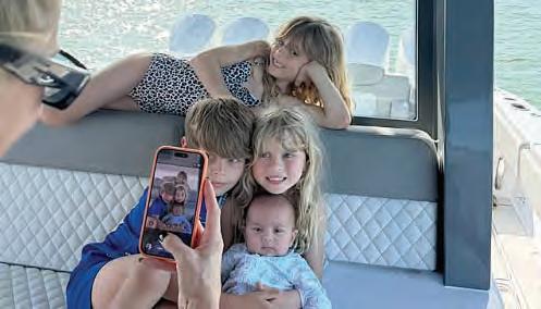 The portrait features a glimpse of Kournikova’s face and her right hand as she holds her cell phone, snapping a picture of the four children posing inside a private yacht, apparently out at sea.
