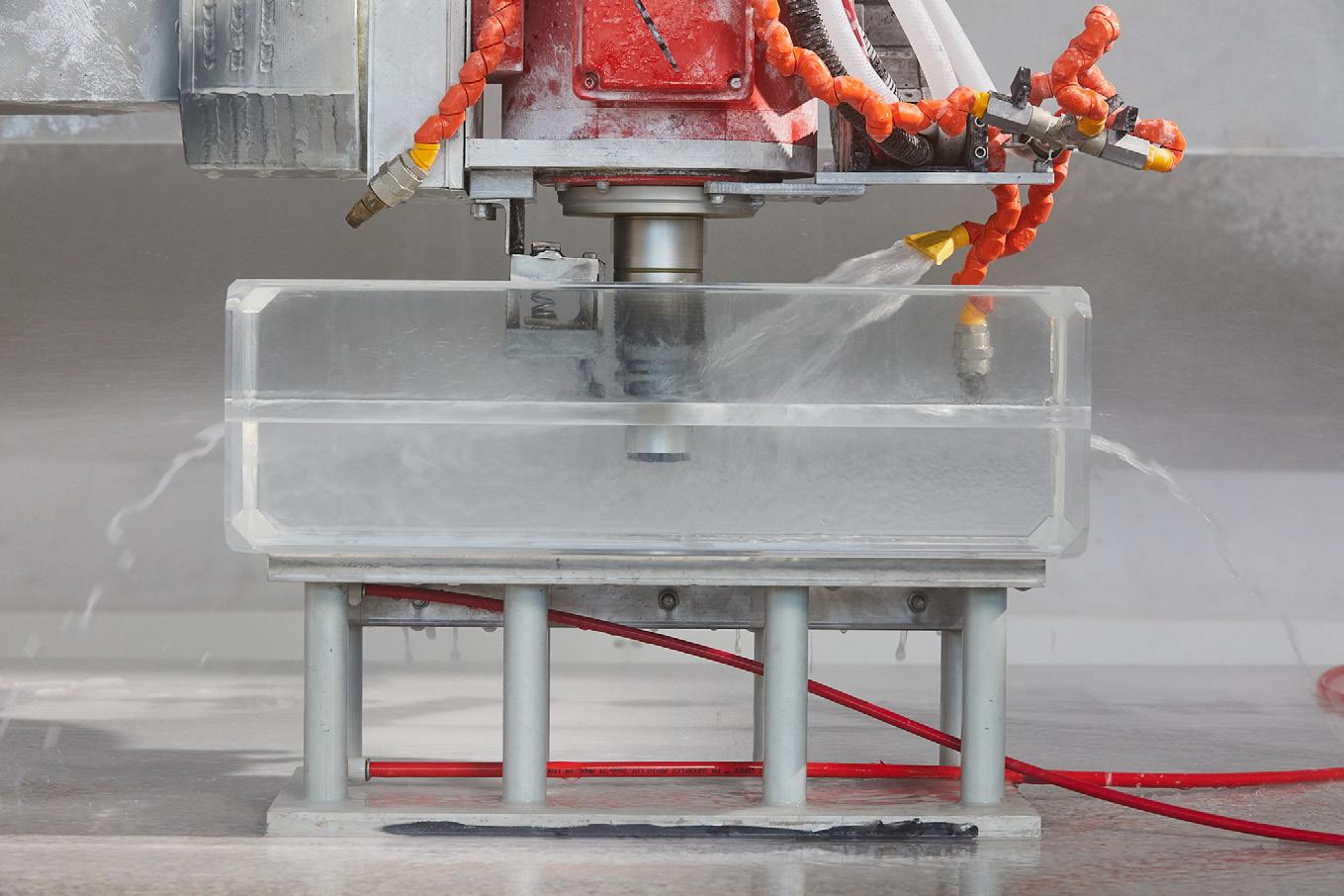 Brambilla fügt hinzu: ‘Die Wahl fiel auf ein Material, das es vor 60 Jahren noch nicht gegeben hätte: ein spezielles bleifreies Kristallglas, das dank seiner Transparenz die Mechanik der Leuchte offenbart.’ Das gewählte Material ist schwer, raffiniert, technisch und recycelbar. Üblicherweise wird es für optische Prismen in Labors und Lasergeneratoren verwendet. Flos setzte eine speziell gebaute Maschine ein, die die gleiche hohe Präzision beibehält, um in dieser Größenordnung hergestellt zu werden.