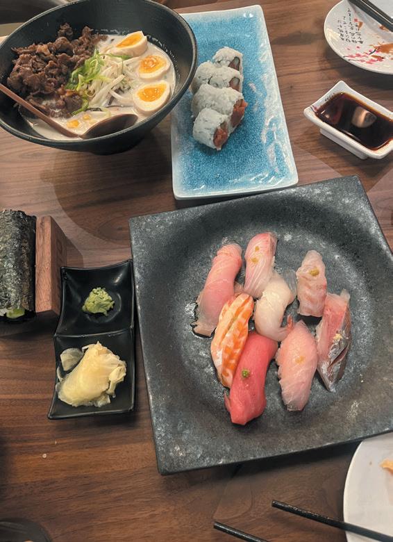 JAPANESE FEAST (clockwise from top left), bulgogi beef ramen, spicy tuna cut roll, assorted sushi, spicy tuna hand roll.