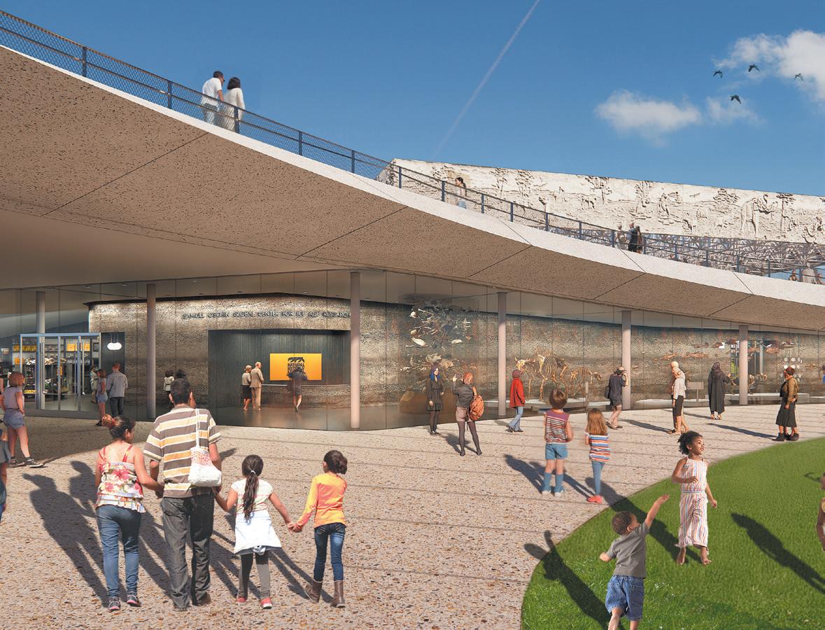 VIEW OF MAIN ENTRANCE and ramp gallery. Renderings: Weiss/Manfredi, courtesy of NHMLAC