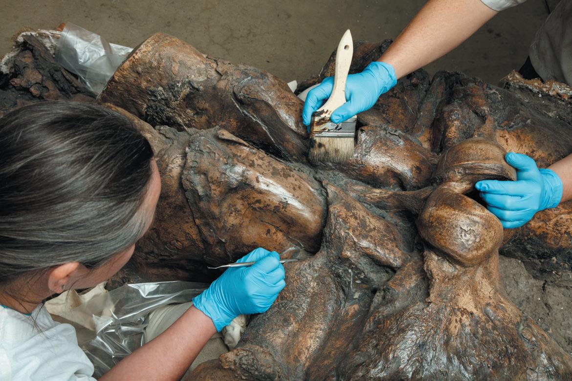 PREPARATORS clean part of the skull of a Columbian mammoth known as Zed in the Fossil Lab at La Brea Tar Pits.