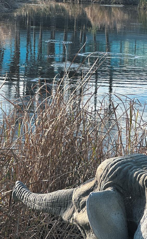 STUCK IN THE MUD. Iconic mammoth family sculpture shows a mammoth becoming trapped in “tar” at Lake Pit left over from asphalt mining operations in the late 1800s. Rain and groundwater collected above