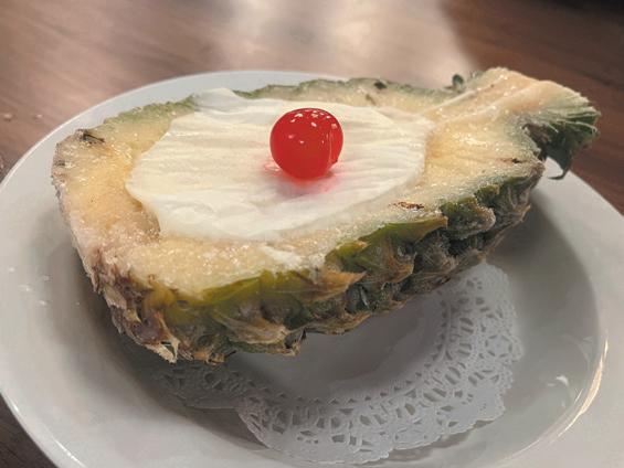 A frozen half pineapple quickly appeared, filled with delicious and creamy pineapple ice cream. However, the premade dessert was clearly just rescued from the deep freeze, and half the ice cream was so hard that even hacking away at it produced no results. Very sad, because the edible portion was truly delicious.