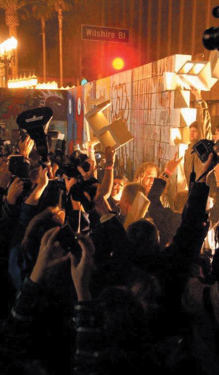 the construction of a tempo rary wall across Wilshire that was then ceremonially torn down at midnight, mirroring the events of 1989.