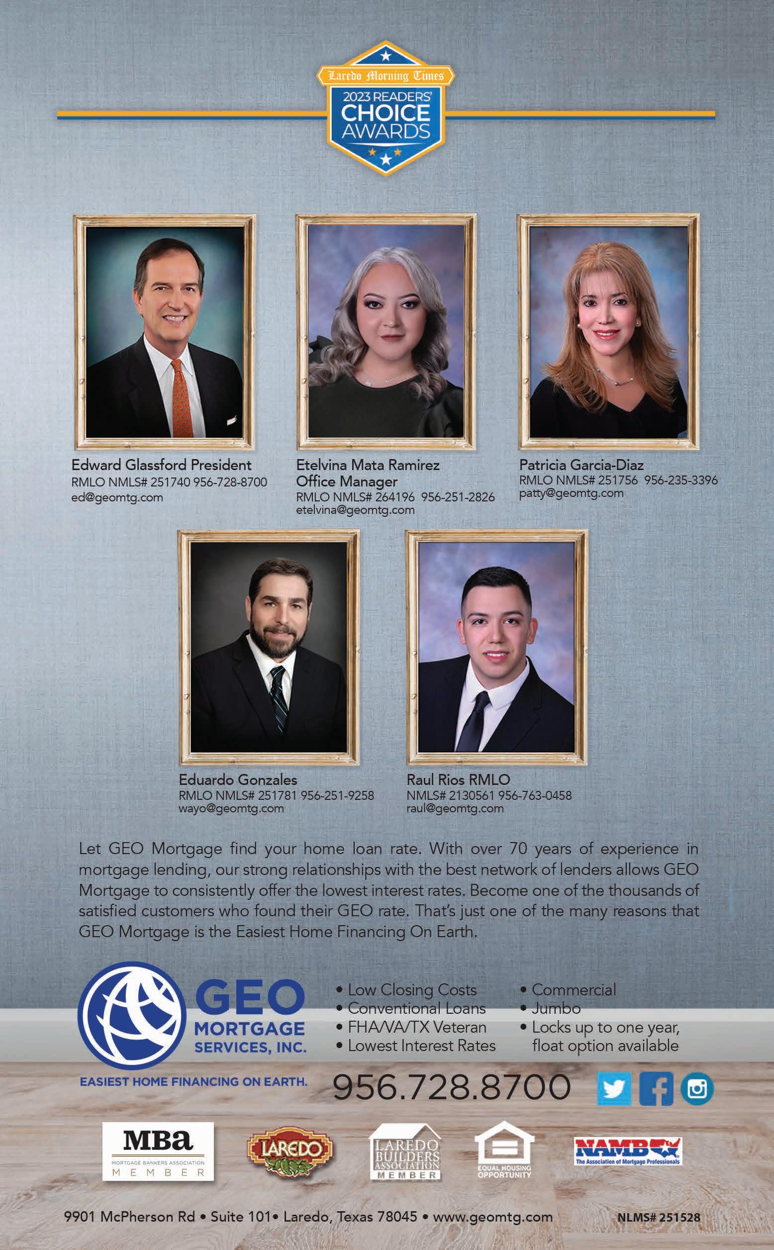 “We make your vision come true from Inception to Completion” SALES 956.602.0344 Our new office is located at 7503 Bartlett Ave. Ste 101 Laredo, TX 78041 MAIN OFFICE 956.724.2500 Ana Laura Leyva Office Manager 956.724.2500 Jorge Guzman Sales Manager 956.740.2778 Carol Garcia Sales Rep. 956.645.1452 Lydia V. Ramos Sales Rep. 956.333.7760 Joe Mata Sales Rep. 210.848.4551 Amir Emami Sales Rep. 956.231.3399 www.re-signature.net • contact@resignaturehome.com SALE AGENTS Join Our Team Be part of one of the leading builders in Laredo! Page 16 | June 2023 | Laredo Real Estate Magazine Page 16