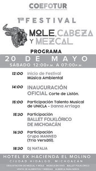 Morelia, Michoacán, 16 de mayo de 2023.- Ciudad Hidalgo, en la región País delaMonarca,invitaalpúblicoengeneral a su Primer Festival del Mole, Cabeza y Mezcal, que se realizará los días 20 y 21 de mayo en las inmediaciones del Hotel ExHaciendaElMolino.