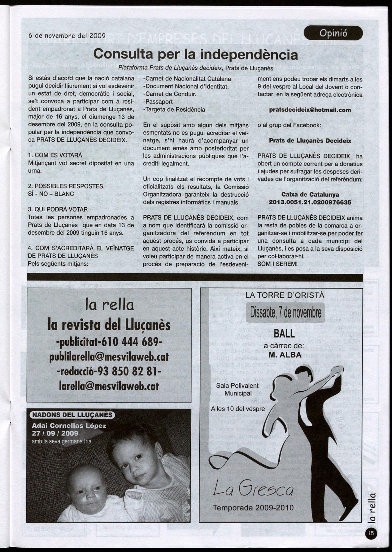 tactar en la següent adreça electrònica se't convoca a participar com a resi- -Passaport dent empadronat a Prats de Lluçanès, -Targeta de Residència major de 16 anys, el diumenge 13 de desembre del 2009, en la consulta popular per la independència que convoca PRATS DE LLUÇANÈS DECIDEIX.