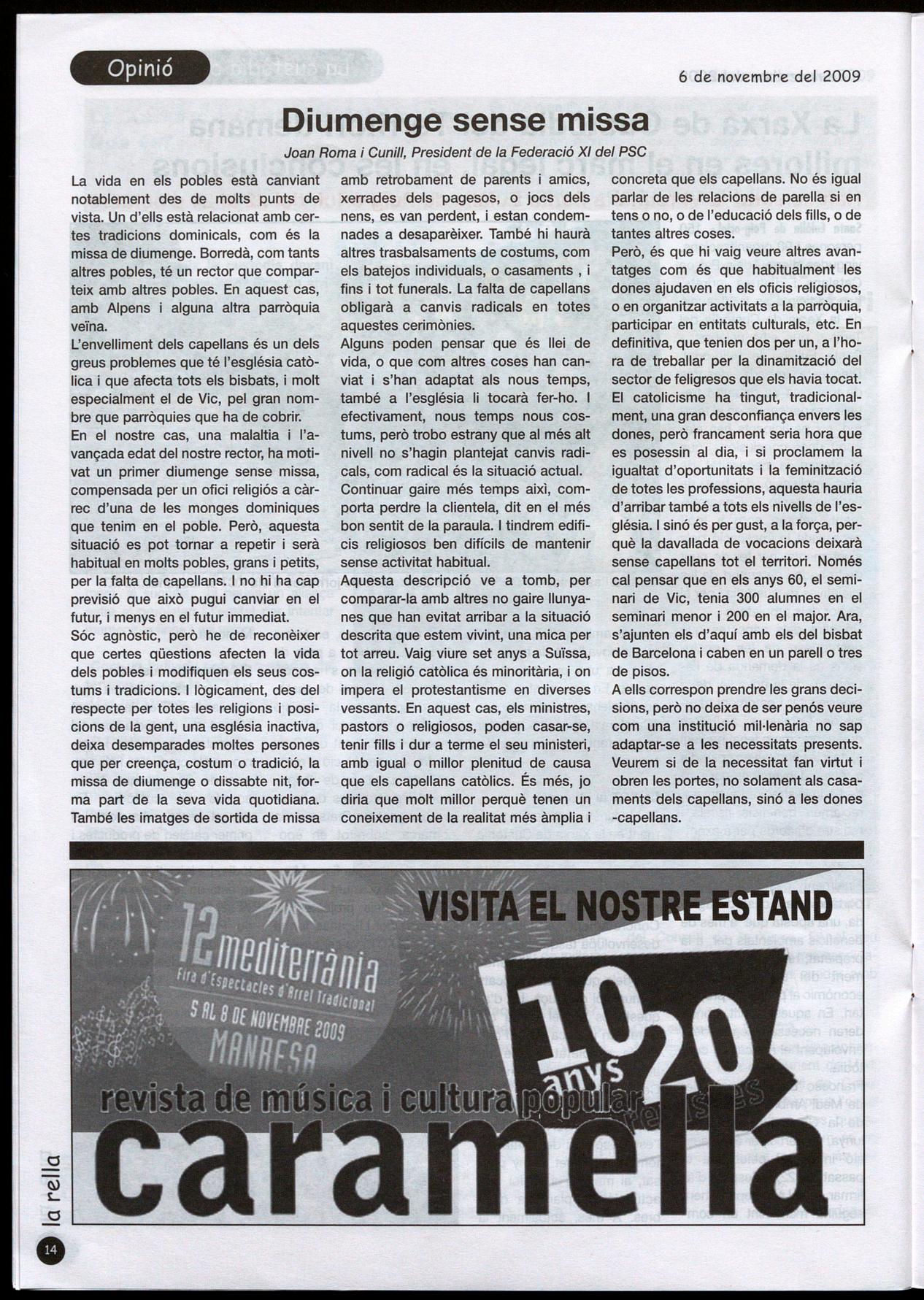 En el nostre cas, una malaltia l'avançada edat del nostre rector, ha motivat un primer diumenge sense missa, compensada per un ofici religiós a càrrec d'una de les monges dominiques que tenim en el poble. Però, aquesta situació es pot tornar a repetir i serà habitual en molts pobles, grans petits, per la falta de capellans. no hi ha cap previsió que això pugui canviar en el futur, menys en el futur immediat. Sóc agnòstic, però he de reconèixer que certes qüestions afecten la vida dels pobles i modifiquen els seus costums tradicions. I lògicament, des del respecte per totes les religions i posicions de la gent, una església inactiva, deixa desemparades moltes persones que per creença, costum a tradició, la missa de diumenge a dissabte nit, forma part de la seva vida quotidiana. També les imatges de sortida de missa