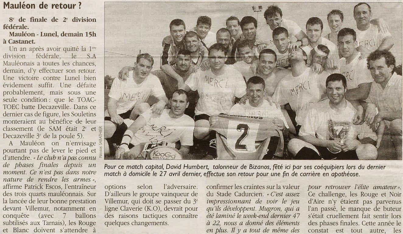 ORSAY ne succédera pas à Massy, sacré champion de France de 3e Division en 1998. Dans cette finale, face aux Béarnais de Bizanos, les Essonniens sont passés au travers et c'est en toute logique qu'ils se sont inclinés sur quatre pénalités de Trieux, le buteur béarnais contre deux d'Alban Salini (6-12). Un match rendu difficile par la canicule. Les Béarnais ont mieux supporté la chaleur et la pression était du côté essonnien. « Nous n'avons pas su assumer notre rôle de favoris, explique Xavier Pujos avec le recul. On a commis des fautes inhabituelles. Mais la plupart des joueurs n'avaient jamais vu une telle ambiance. » Quand les deux équipes entrent sur le terrain, les 700 supporters béarnais entonnent un chant basque qui a le don de pétrifier les Orcéens. Même les supporters des Tango restent bouche bée. On se croirait à Twickenham ! « On ne doit pas avoir de regrets, ajoute le 3 e ligne Manuel Cosneau. Bizanos était plus fort. » Pas de quoi faire oublier un superbe cru. L'équipe première n'a perdu que 2 matchs sur 28 et la montée directe a été confirmée il y a belle lurette, tandis que la réserve a également échoué en finale. Orsay a ainsi été désigné meilleur club fédéral, remportant le Trophée 51 de l'offensive et du fair-play. « Nous voulons être le club référence de la vallée de Chevreuse, annonce le président Paul Tremsal. Nous voulons atteindre la 1re Division en gardant cet état d'esprit et cette convivialité qui font notre force. » « La plupart des joueurs se connaissent depuis une quinzaine d'années, ajoute Pujos, grand chef de cette recette à succès en compagnie de son complice Alain Fior. Tout le monde est logé à la même enseigne. » Et l'entraîneur d'Orsay de citer l'exemple du talonneur Denis Chailloux (33 ans), le plus ancien de l'équipe. Métamorphosé, l'ex-Chiroquois et Massicois, souvent abonné aux cartons, est devenu un exemple pour les jeunes du club. Orsay entend bien poursuivre cette politique l'an prochain en 2 e Division. Les petits hommes au maillot orange et noir nous réservent sûrement encore de belles surprises.
