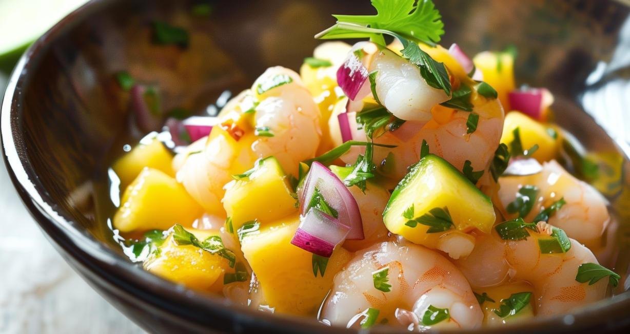 Ceviche tripula de camarón y mango.