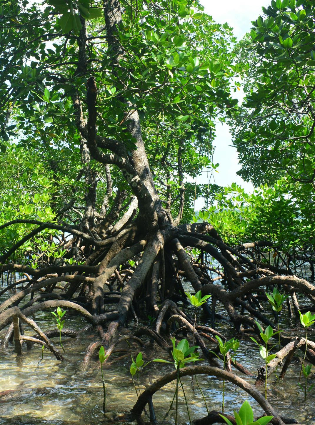 Los manglares son árboles tolerantes a la sal con raíces expuestas e intrincadas que crecen en zonas intermareales de regiones tropicales y subtropicales. Los humedales costeros que forman protegen a las comunidades humanas costeras de marejadas ciclónicas y tsunamis, crean hábitat para peces y otra fauna, almacenan carbono y mejoran la calidad del agua.