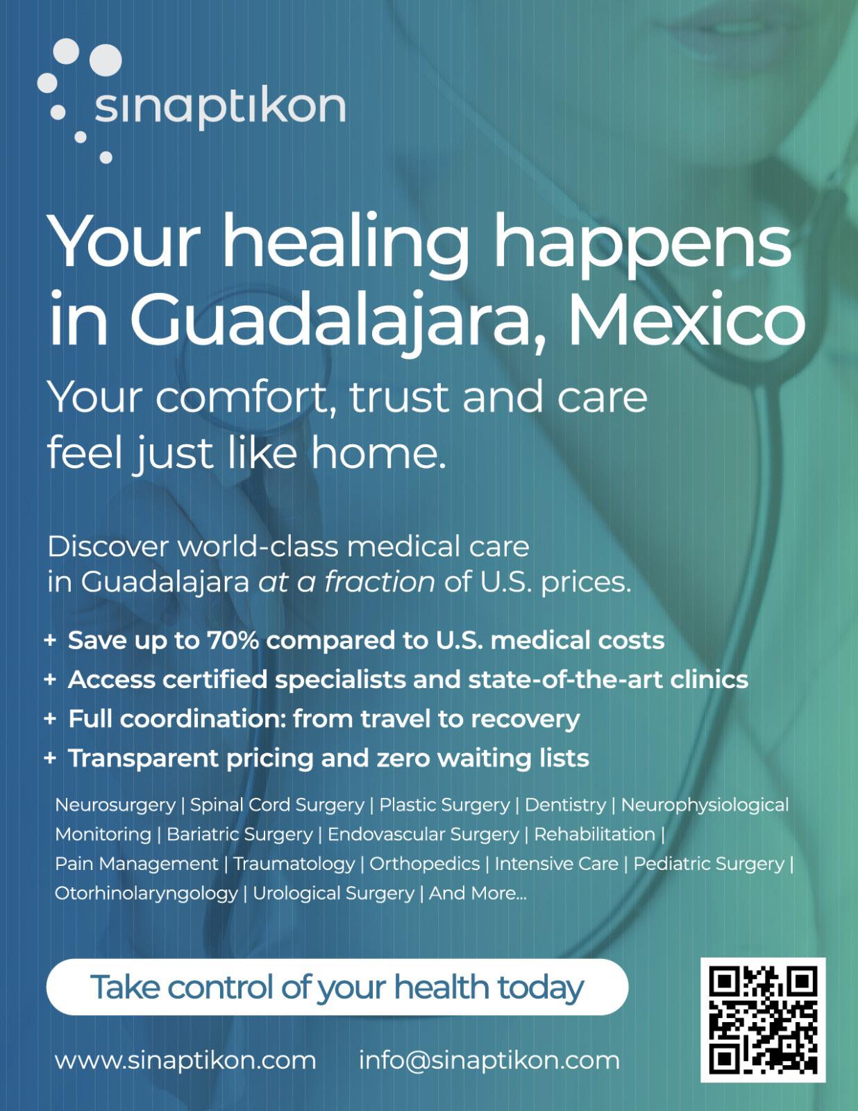 En el corazón de este ecosistema se encuentra SINAPTIKON, el principal facilitador de turismo médico de la ciudad. Como un referente de confianza, conectan a los pacientes con los mejores médicos, hospitales, opciones de recuperación e incluso experiencias culturales, todo en un mismo lugar. Para quienes buscan no solo tratamiento médico, sino una experiencia de sanación integral y sin estrés, Guadalajara, y SINAPTIKON, son el destino ideal. A medida que la demanda mundial de turismo médico sigue en aumento, Guadalajara no solo se mantiene al día, sino que también establece nuevos estándares para lo que debería ser un destino de turismo médico. Ya sea un procedimiento dental de rutina, una cirugía compleja o un retiro de bienestar integral, Guadalajara ofrece todo lo que un turista médico podría desear.