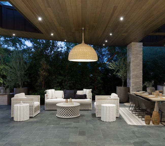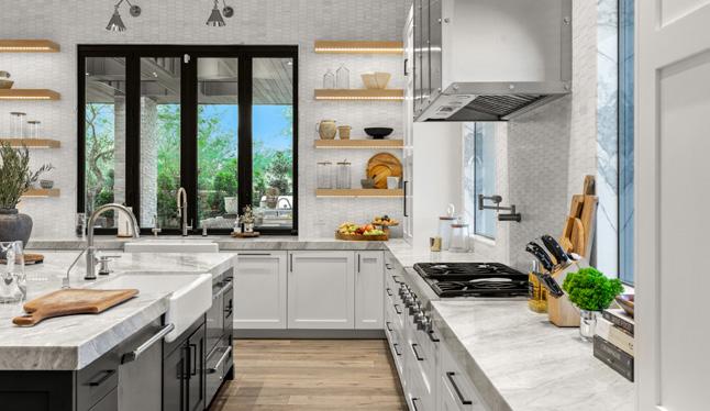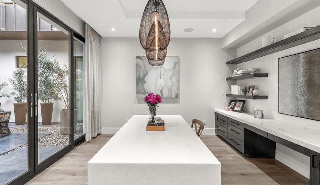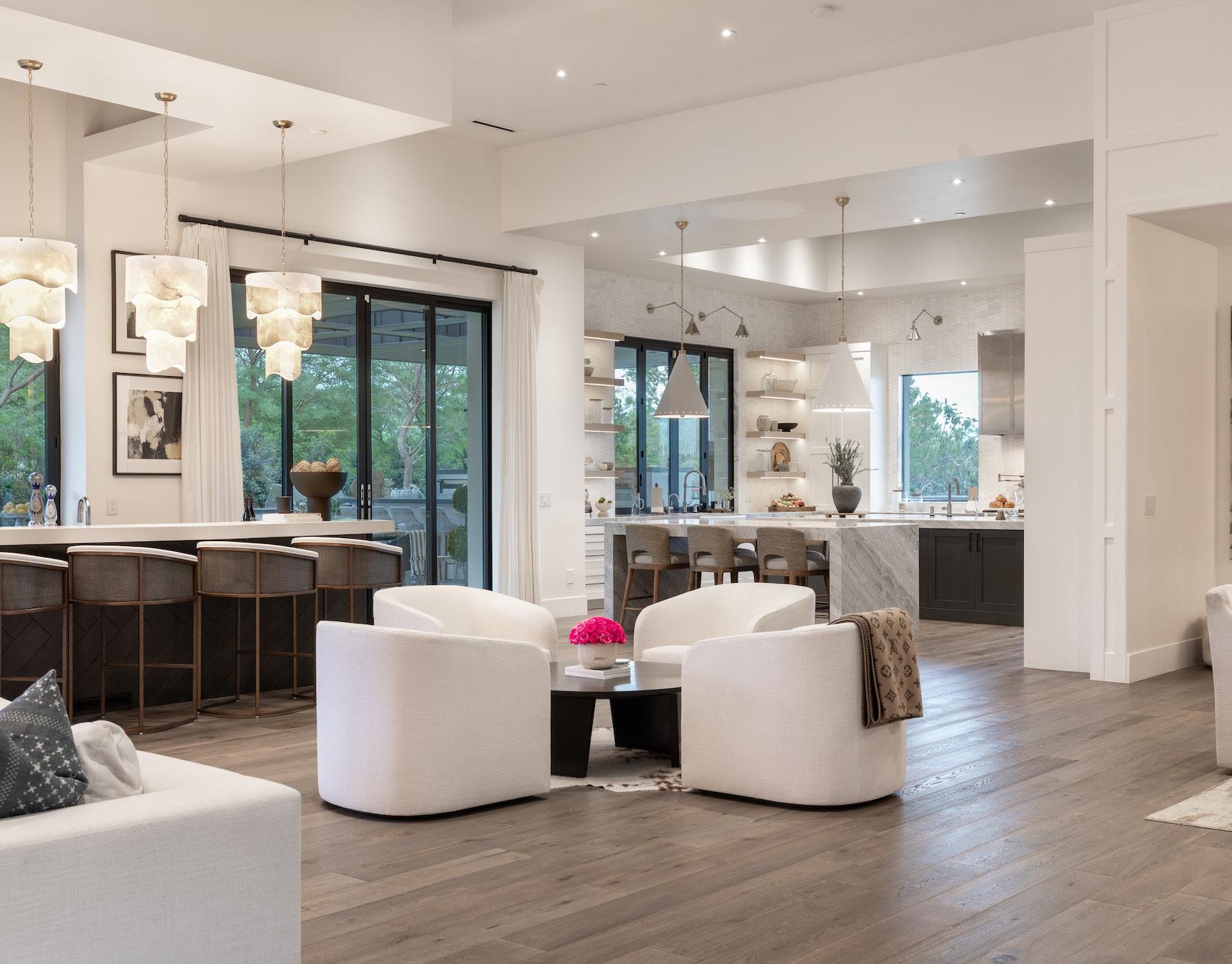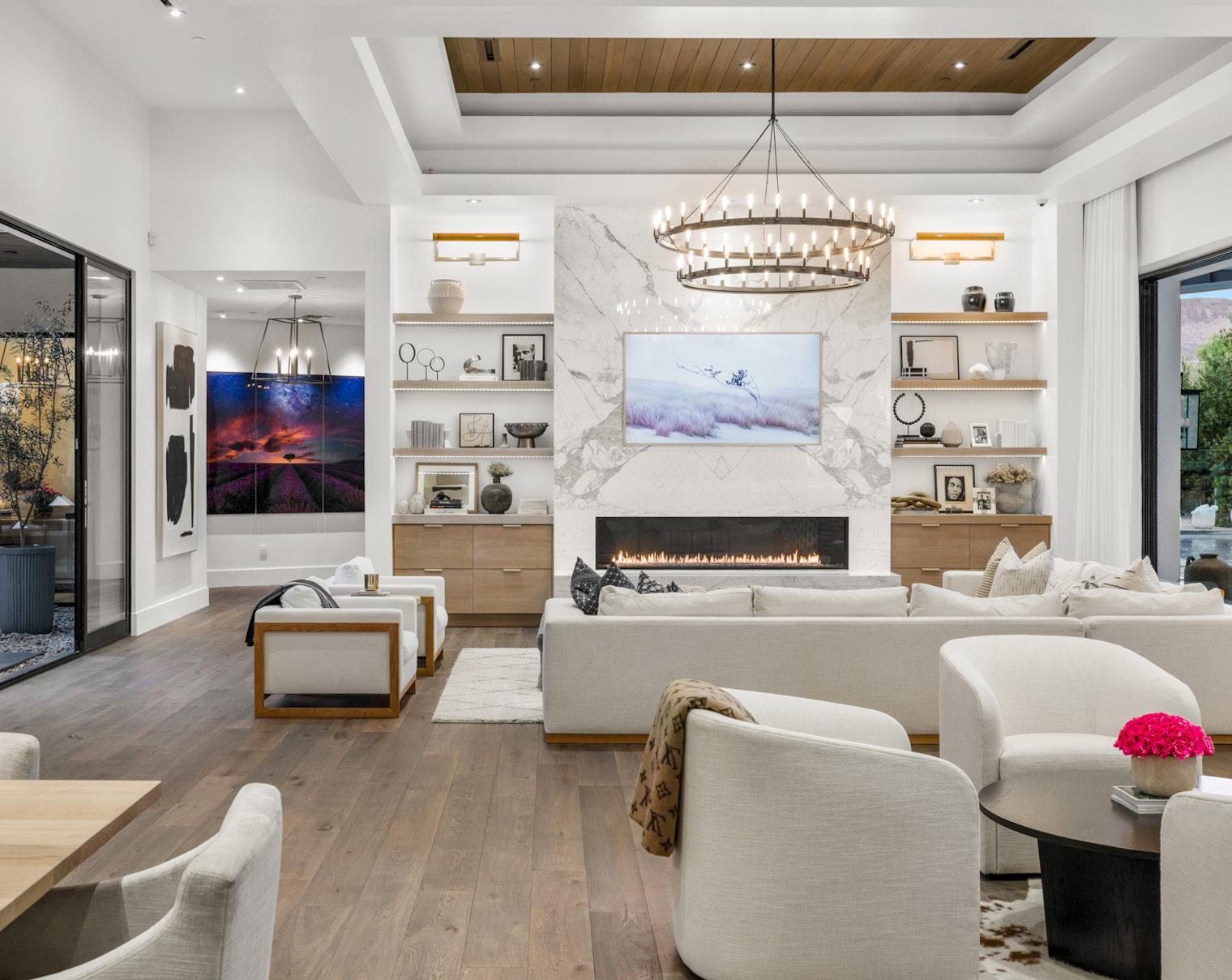 The open concept floor plan features a Calcutta fireplace, wood accented ceilings, an indoor/outdoor bar, a chef’s kitchen with double islands & a marble backsplash, designer light fixtures & millwork accent walls.