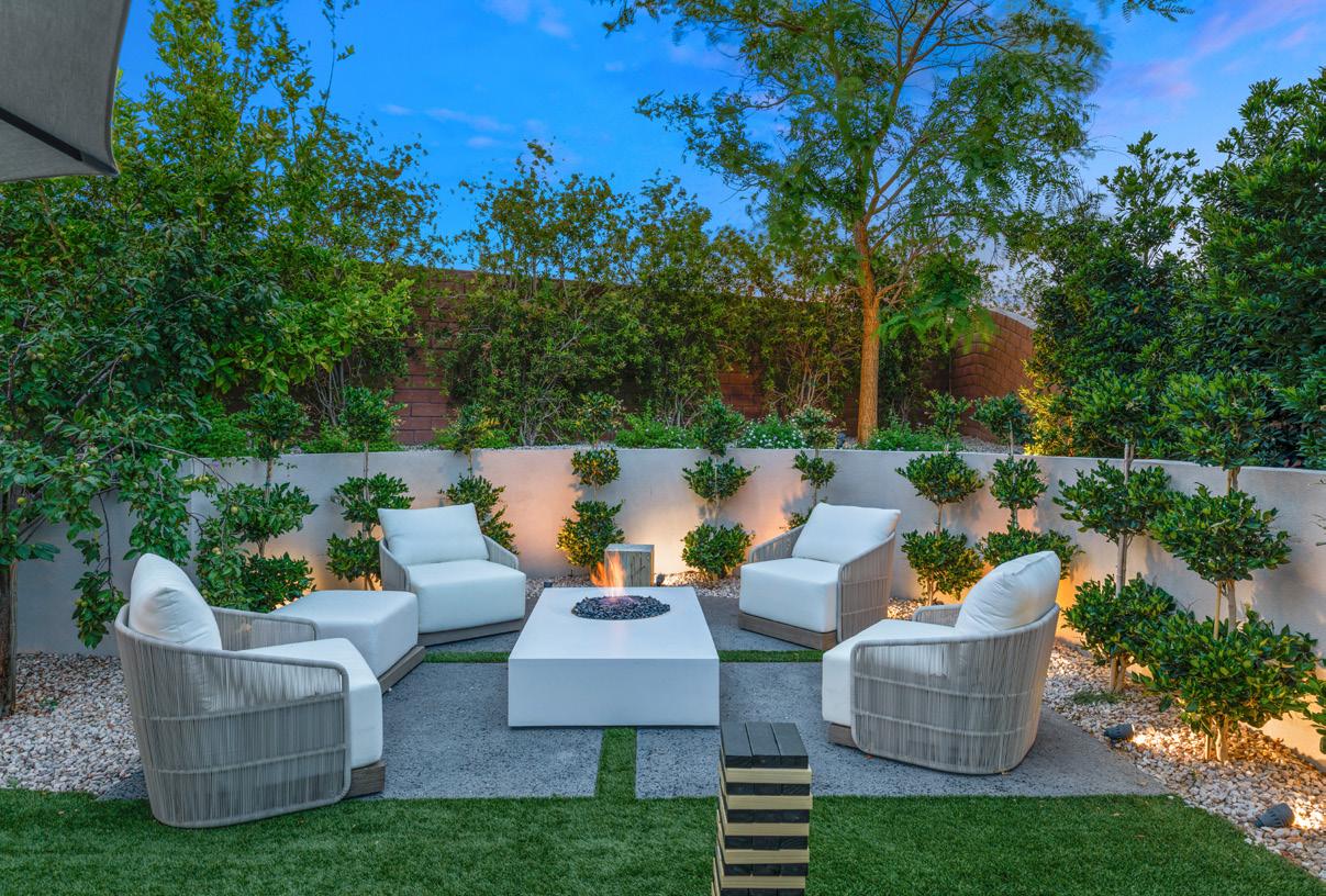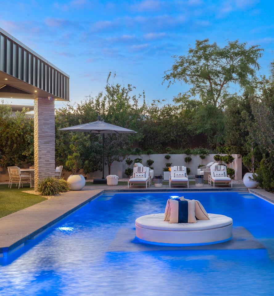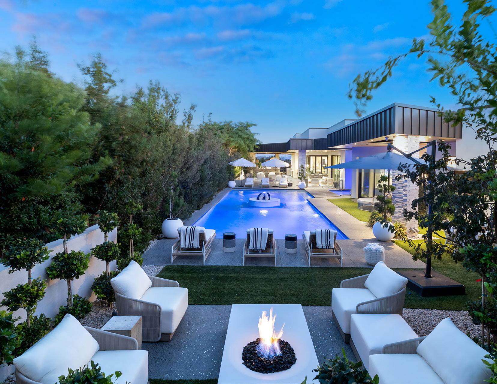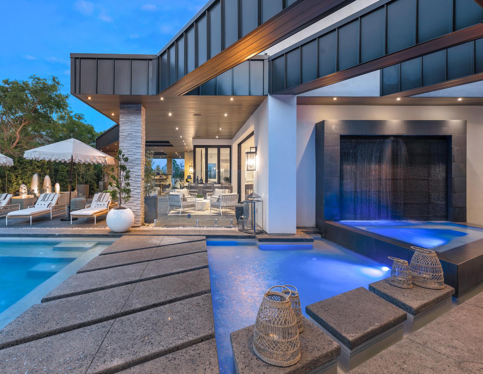 The immaculately landscaped backyard is a paradise featuring a 55-foot-long pool with a center island, water features, a fire pit, a full outdoor kitchen and sport court.