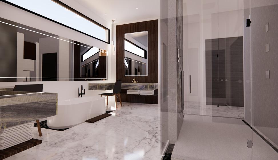 The primary bedroom is planned for downstairs with custom closets. Architectural renderings showcase a modern masterpiece that echoes 637 Dragon Peak’s desert environment while featuring the best in technology and aesthetic design.