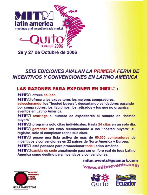 La Ciudad de Quito, Ecuador, será la próxima sede de MITM Latin America – Meetings and Incentive Trade Market – 2006, próxima a realizarse del 26 al 28 de octubre de 2006.