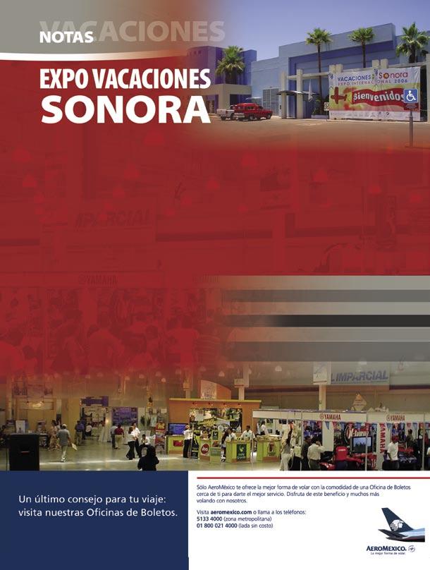 El sector turístico de México tuvo la oportunidad de ofertar sus productos y servicios en el Centro de Convenciones Expo Forum, en Hermosillo, Sonora, los pasados 9, 10 y 11 de junio durante la primera edición de “Vacaciones por Sonora, Expo Internacional 2006”, cuyo fin fue establecer nuevos mercados y oportunidades de negocios al público asistente.