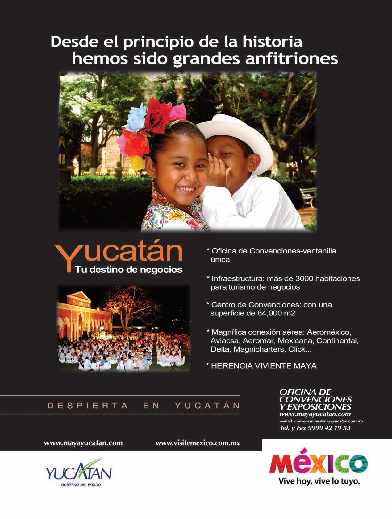 Izamal o Ciudad Amarilla, considerada también Pueblo Mágico, muestra la conjunción entre pirámides, conventos, plazas y hogares. Sobre algunas pirámides se construyeron otros edi!cios, como el caso del convento de San Antonio de Padua, fundado por Fray Diego de Landa en 1549. Este convento es el escenario de un espectáculo que brinda al turista de negocios una visión de la cultura maya, la cual se vale de luz y sonido y se conjuga con la bella vista de estrellas que engalanan la noche.