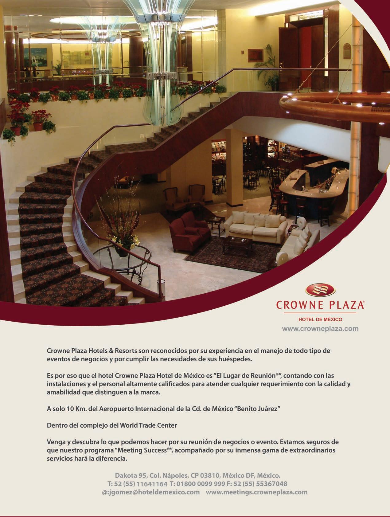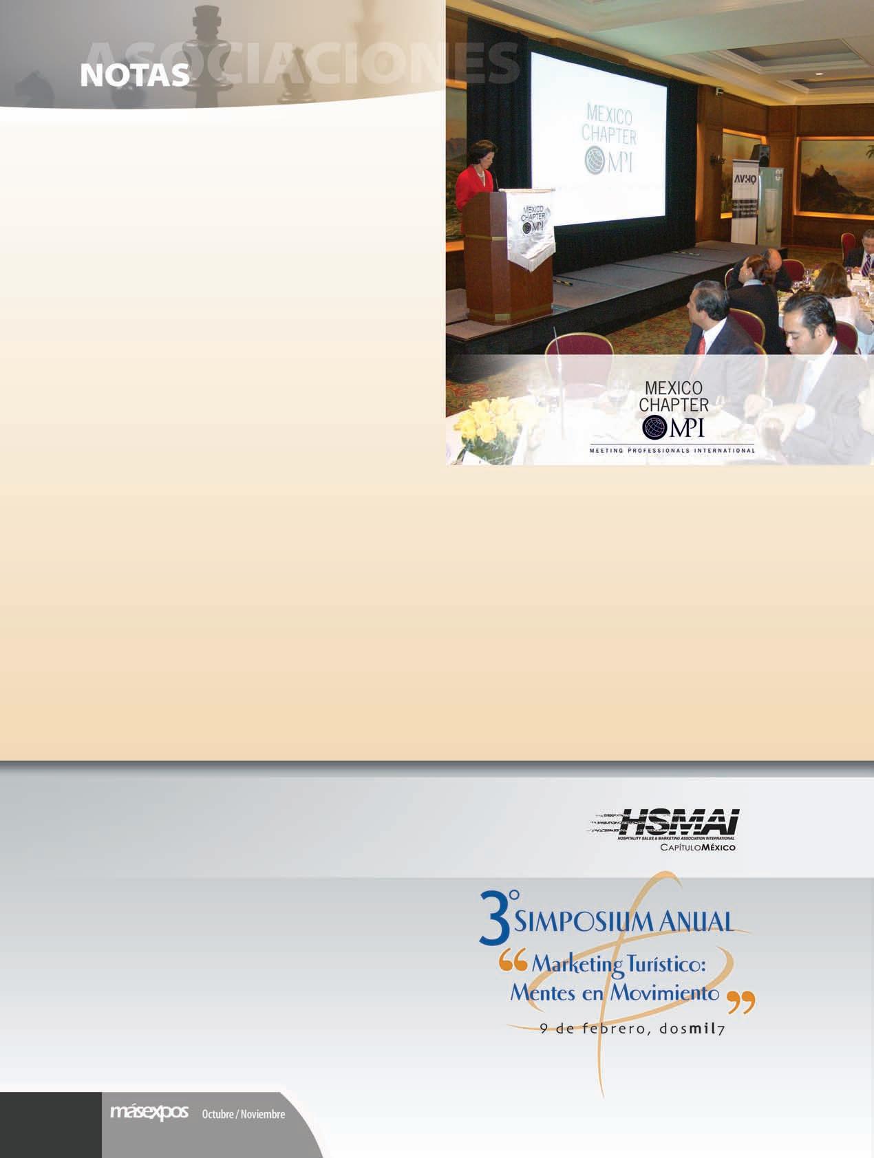 Bajo el mismo contexto, Antonio Torres señaló que parte de esta consolidación debe darse gracias a la participación activa que se tenga con instituciones y asociaciones dedicadas al turismo de negocios, como el Consejo de Promoción Turística de México y la Asociación Mexicana de Hoteles y Moteles de la Ciudad de México, para que en conjunto se atraigan más eventos, mostrando las posibilidades y alternativas que hay en el radio de in uencia de la ciudad.