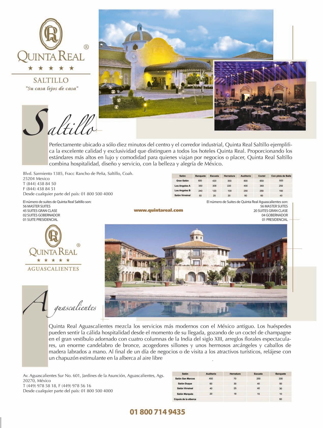 Cabe destacar la oferta hotelera del destino, que comprende más de 1,500 habitaciones de calidad turística, divididas en cerca de 17 hoteles, como La Noria, Quinta Real, Fiesta Americana, Holiday Inn, Las Trojes, entre muchos otros. En lo que se re!ere a espacios para eventos, la oferta del destino es amplia, y va desde las instalaciones de la Feria de San Marcos y la Nave de Locomotoras hasta salones en hoteles como Andrea Alameda y el Medrano.